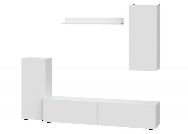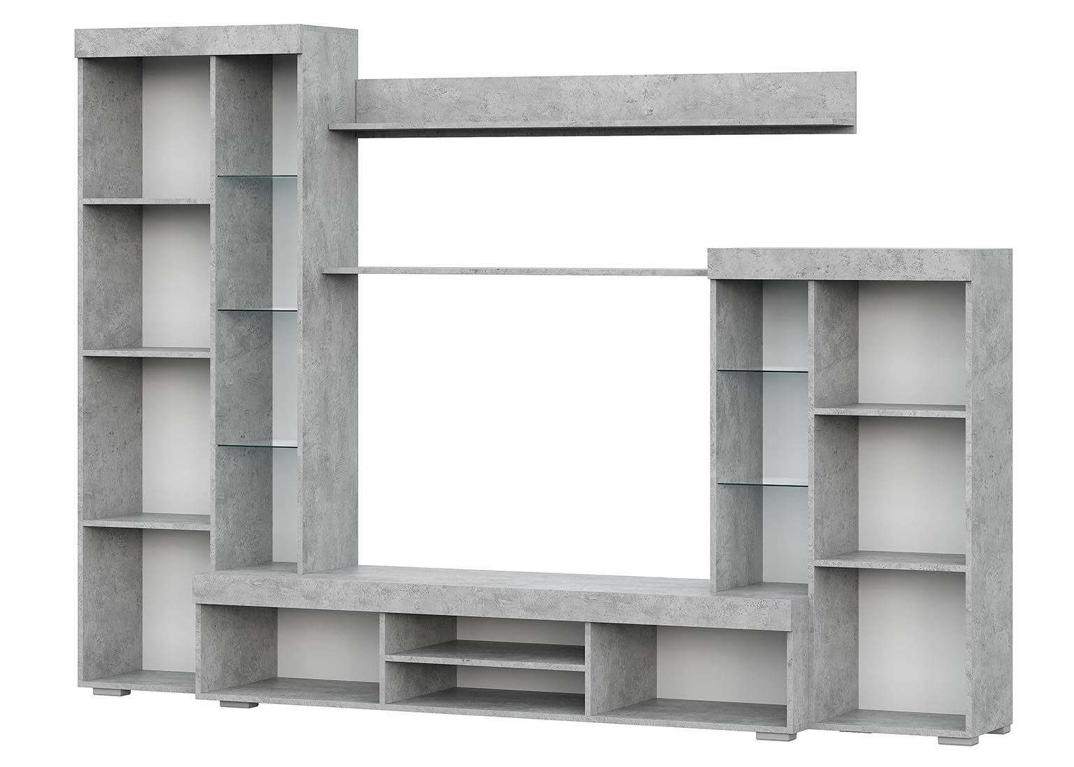 Гостиная «МГС 5» представлена в оттенке светлого цемента с белыми декоративными элементами на фасадах. Эта стильная стенка не только визуально привлекательна, но и функциональна. Она обладает различными возможностями хранения, такими как ниши для книг, стеллажи для аксессуаров, закрытые отсеки для одежды, посуды или документов, а также специальная ниша для телевизора размером 1210х824х456 мм.
