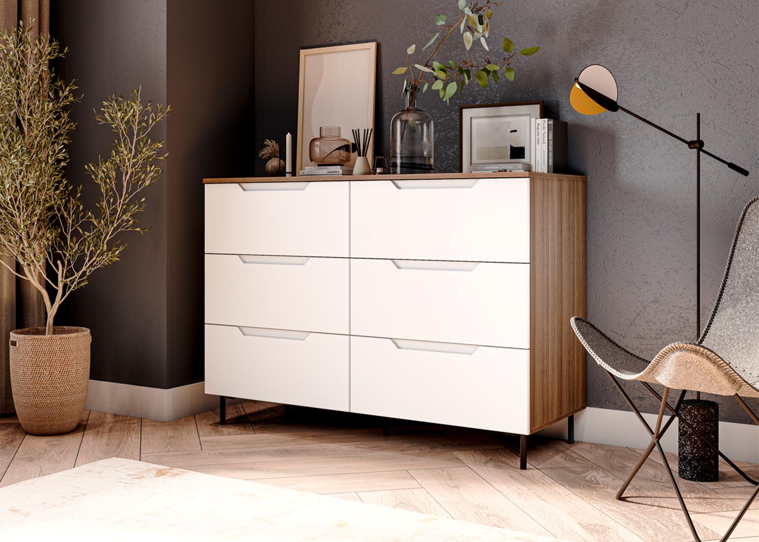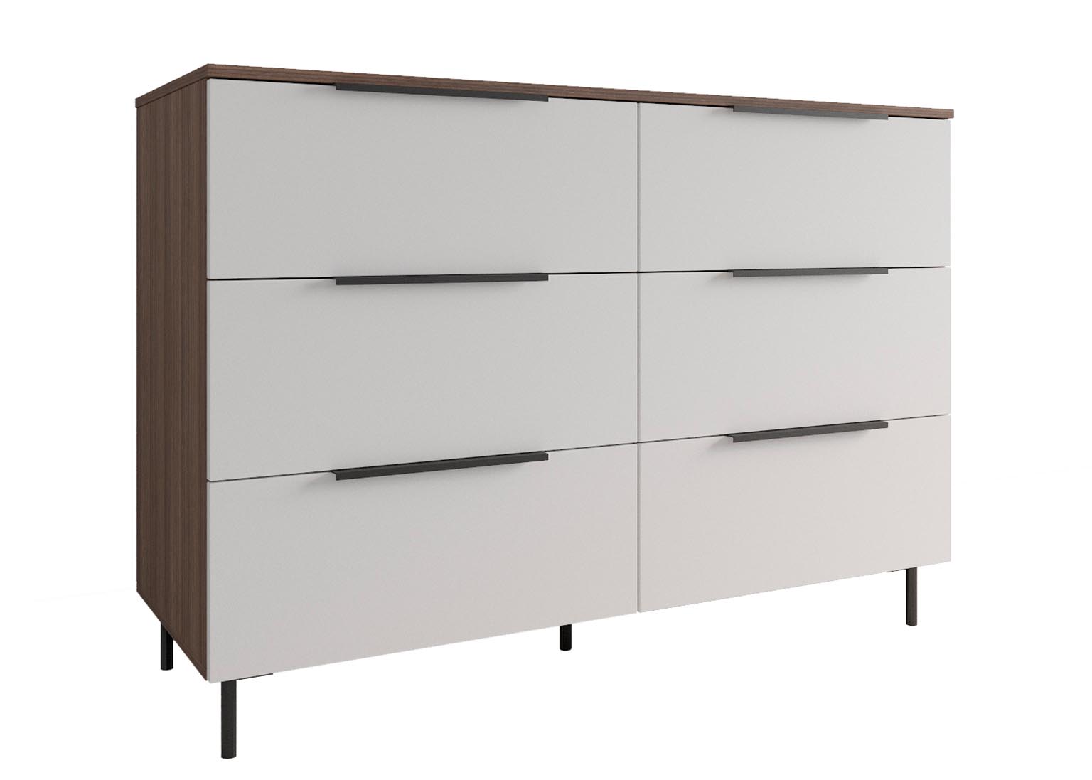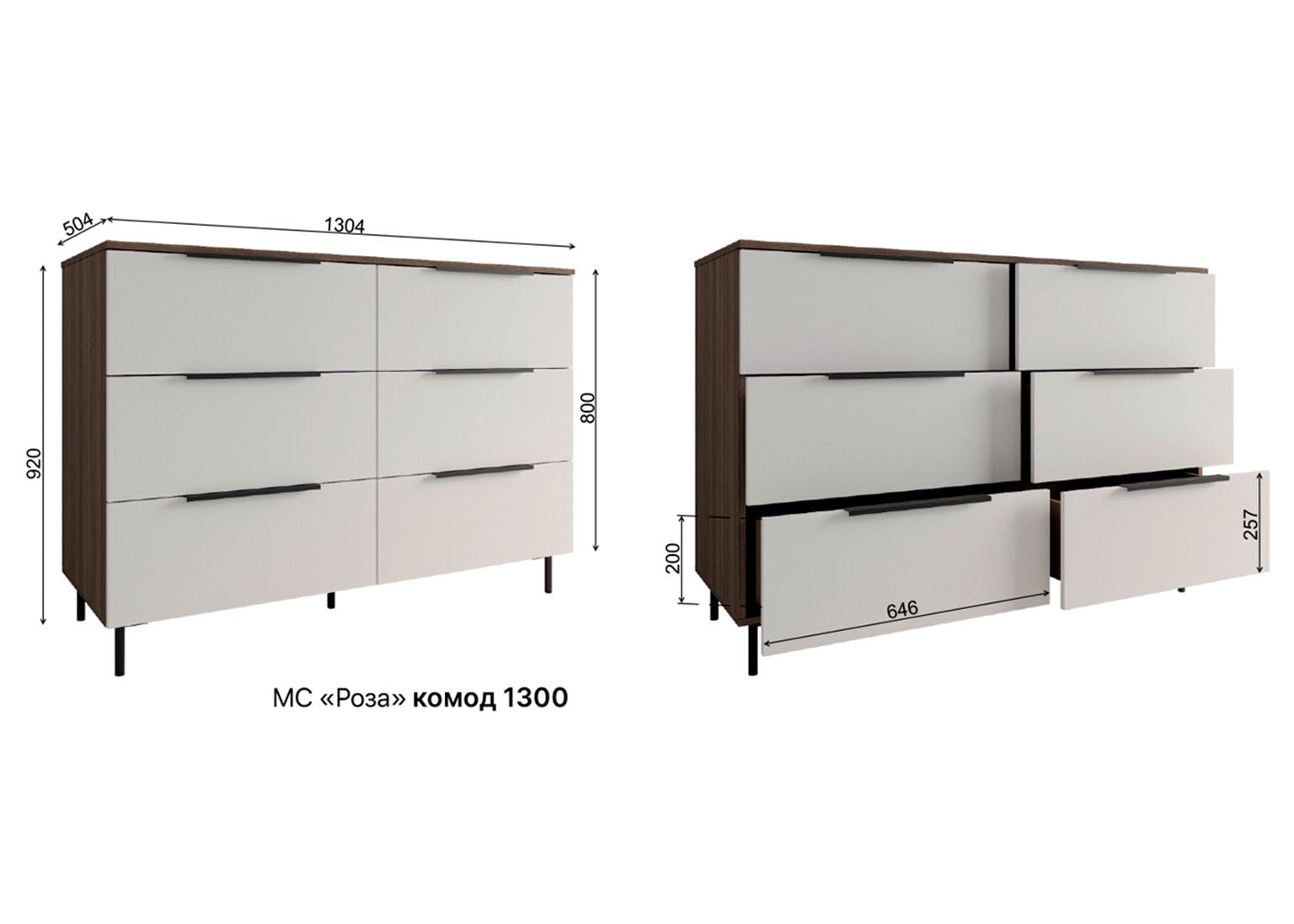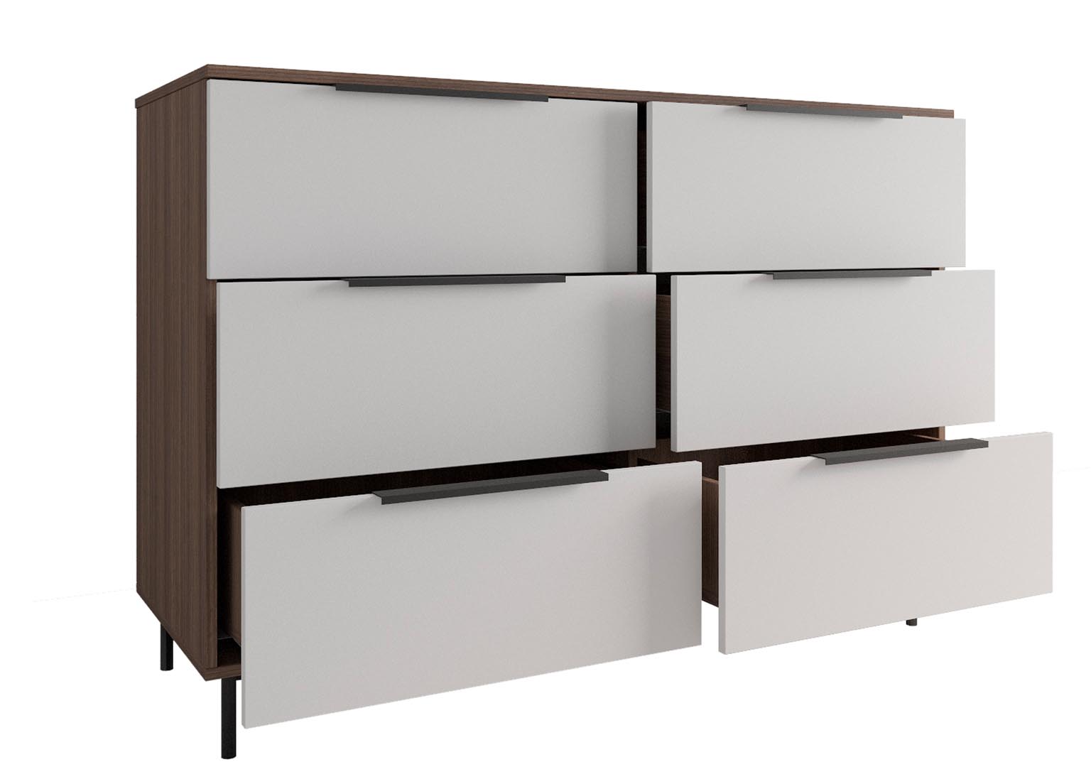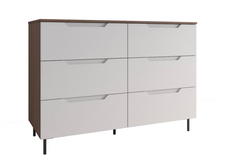 Комод 1300 «Роза» Белый имеет 6 выдвижных ящиков, которые обеспечивают достаточно места для хранения различных вещей. Фасады ящиков выполнены из МДФ, что обеспечивает прочность и долговечность. Фурнитура скрытого монтажа с доводчиками гарантирует плавное закрывание ящиков, что предотвращает повреждение фурнитуры и сохраняет их внешний вид на долгое время. Металлические ножки высотой 12 см в количестве пяти штук обеспечивают равномерную нагрузку на поверхность пола и создают дополнительную устойчивость.
