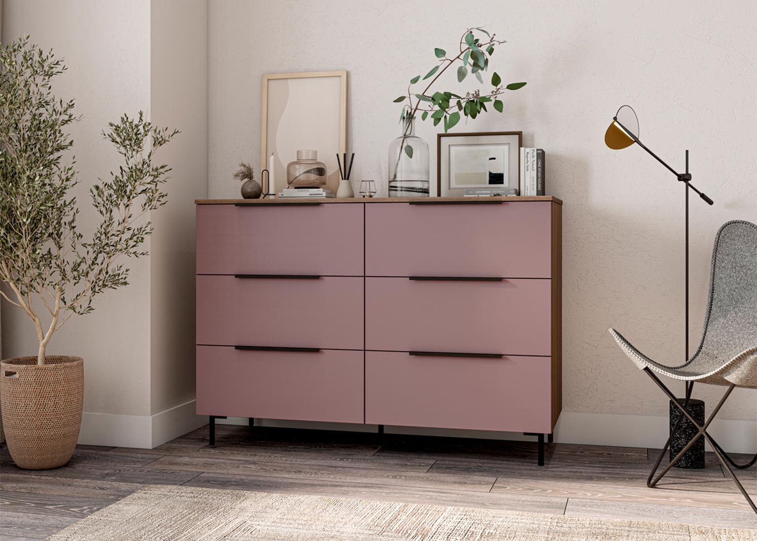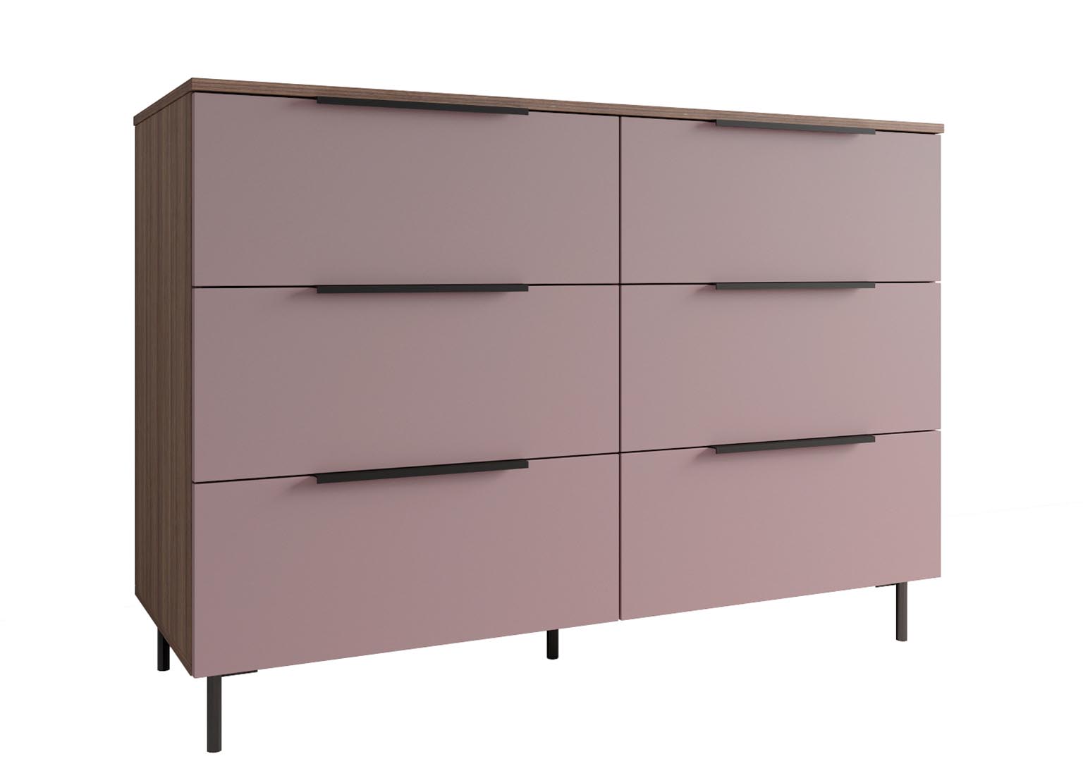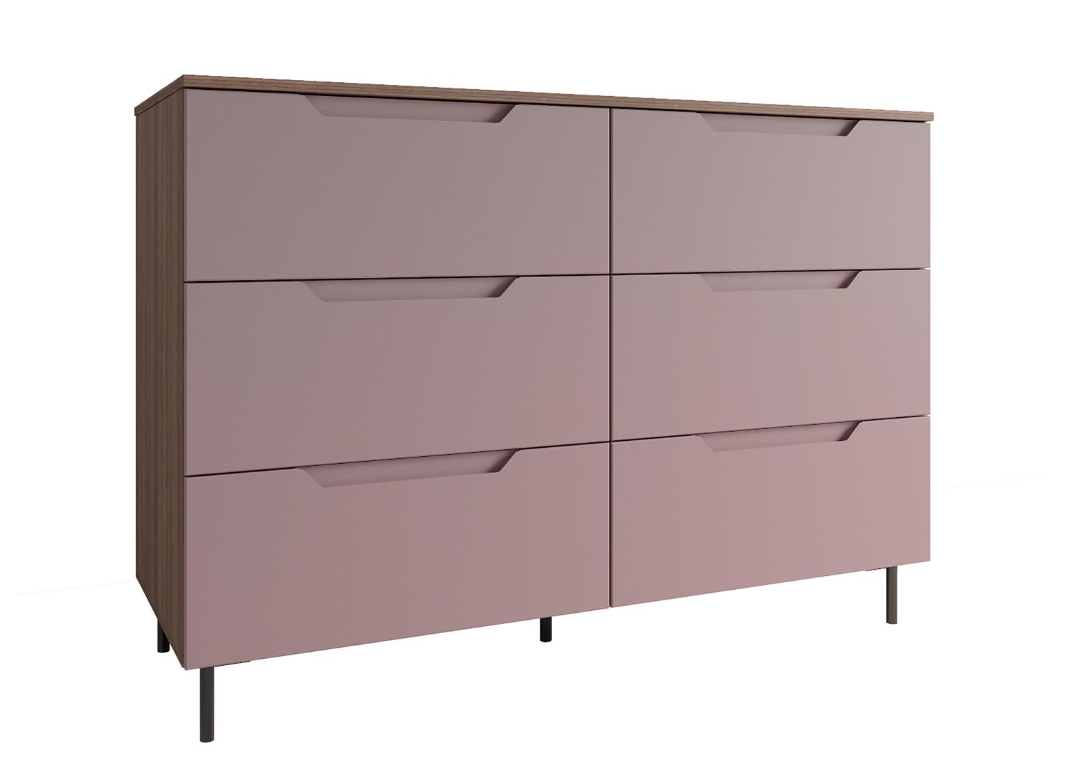 Комод 1300 «Роза» Пудра имеет 6 выдвижных ящиков, которые обеспечивают достаточно места для хранения различных вещей. Фасады ящиков выполнены из МДФ, что обеспечивает прочность и долговечность. Фурнитура скрытого монтажа с доводчиками гарантирует плавное закрывание ящиков, что предотвращает повреждение фурнитуры и сохраняет их внешний вид на долгое время. Металлические ножки высотой 12 см в количестве пяти штук обеспечивают равномерную нагрузку на поверхность пола и создают дополнительную устойчивость.
