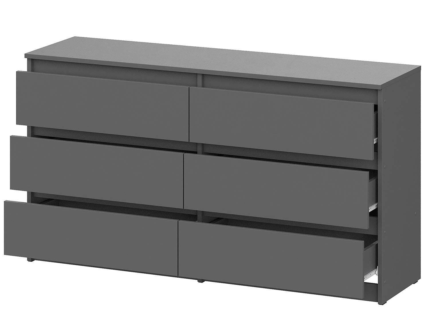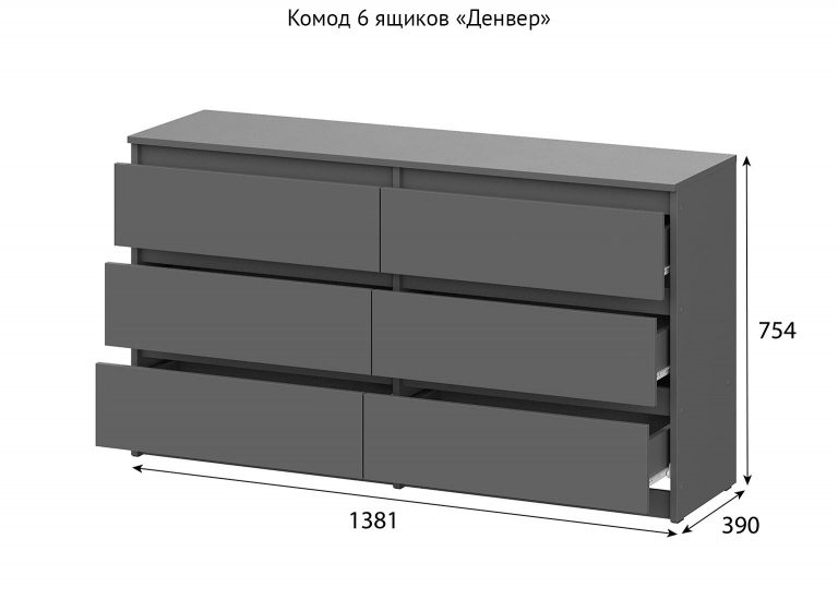 Комод «Денвер» имеет 6 ящиков с роликовыми направляющими без возможности установки доводчиков. Максимальная нагрузка на ящики — 5 кг. Комод изготовлен из высококачественного ЛДСП в цвете «Графит серый» и выполнен в минималистичном стиле, поэтому ящики не имеют ручек и открываются за выступающие торцы фасадов.
