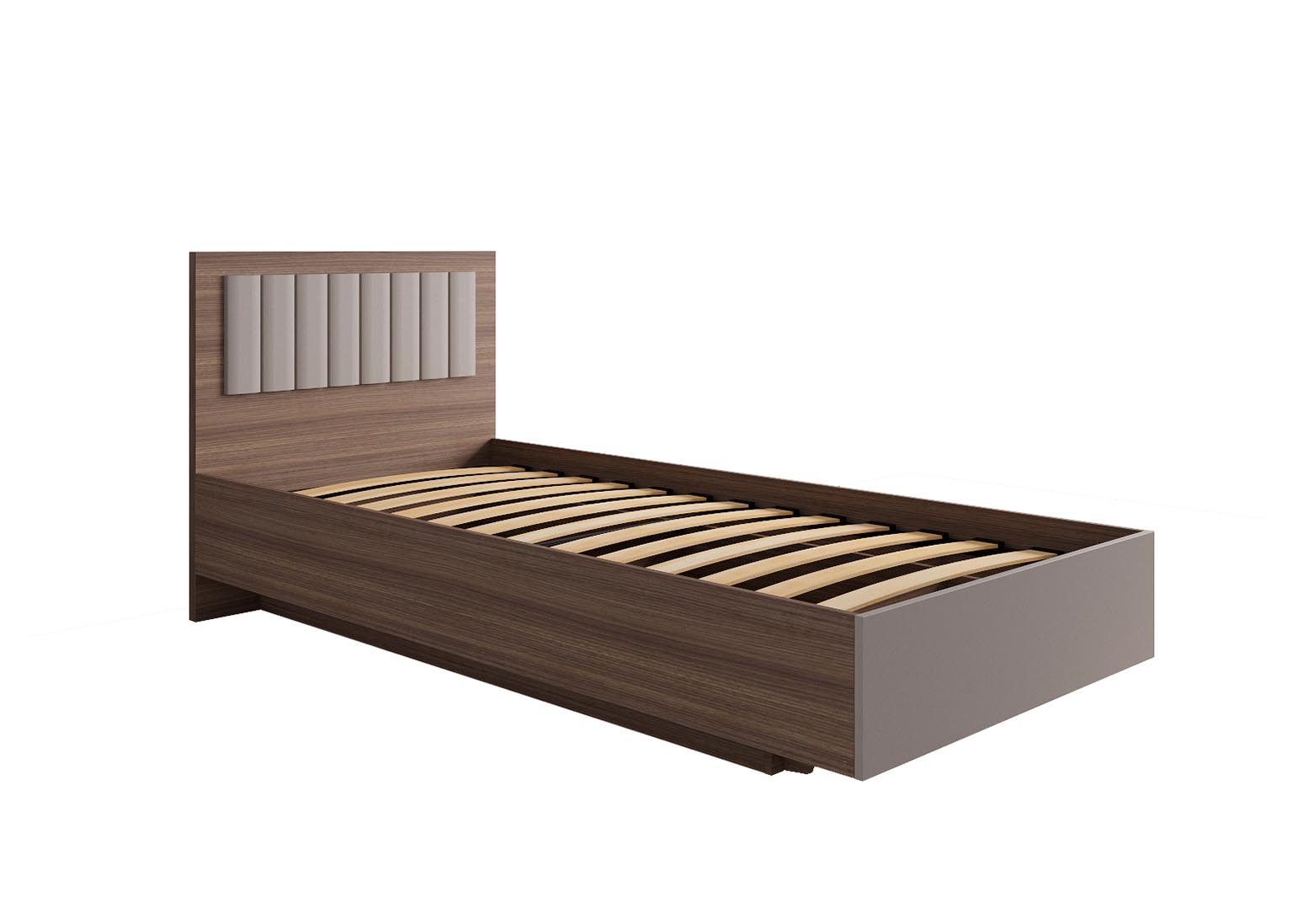 Изголовье кровати выполнено из плиты ЛДСП толщиной 32 мм, а также вставки МДФ 16 мм. Рекомендуемый размер матраса — 900×2000 мм.