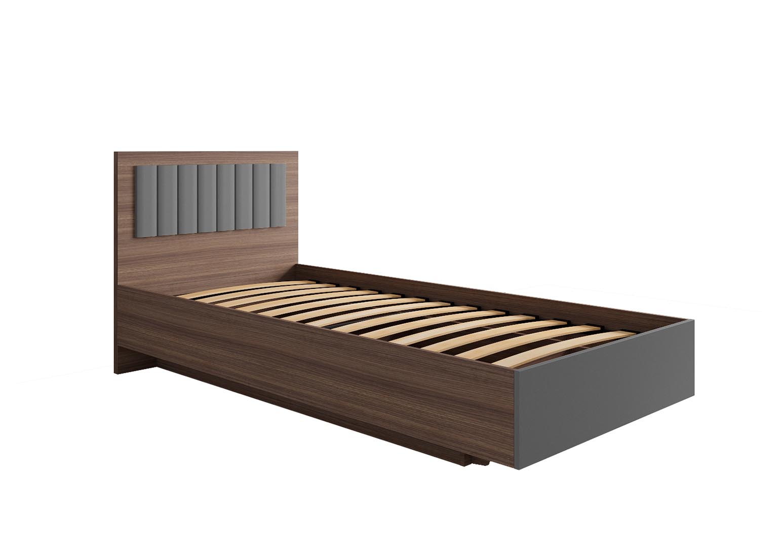 Изголовье кровати выполнено из плиты ЛДСП толщиной 32 мм, а также вставки МДФ 16 мм. Рекомендуемый размер матраса — 900×2000 мм.