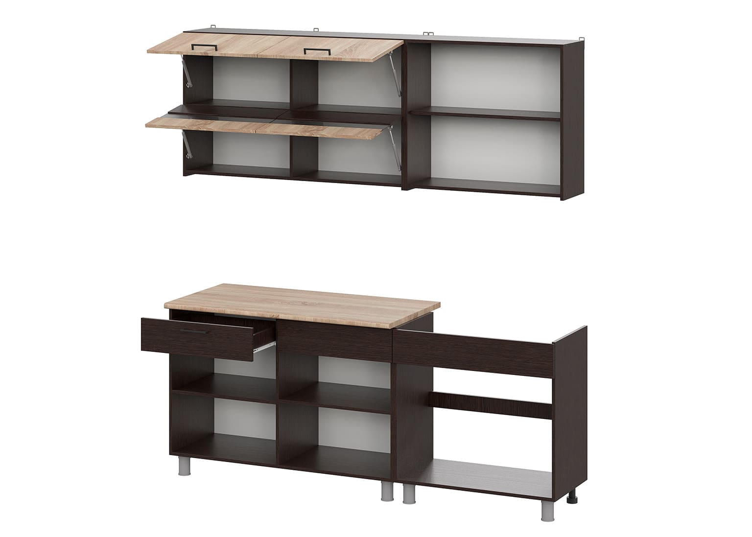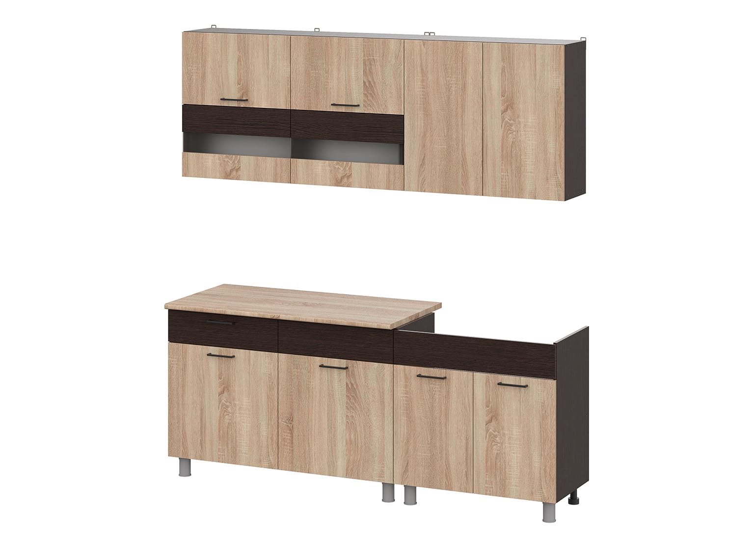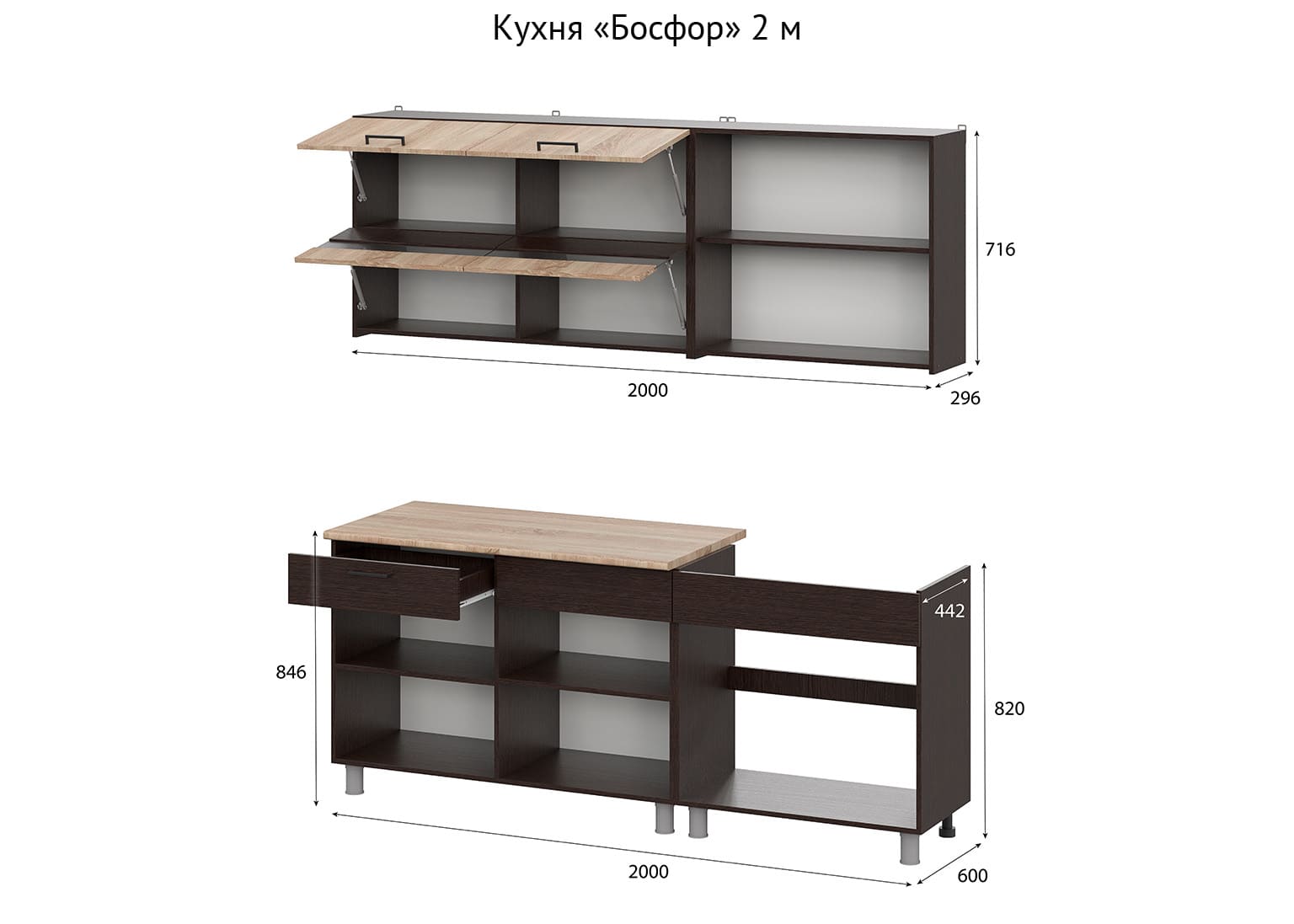 Кухня «Босфор» выполнена в гармоничном сочетании цветов «Венге» и «Дуб Сонома», что делает её универсальным выбором для различных стилей интерьера. Размеры гарнитура составляют 2000 мм в длину, 846/716 мм в высоту и 600/296 мм в глубину, что позволяет максимально эффективно использовать пространство вашей кухни.