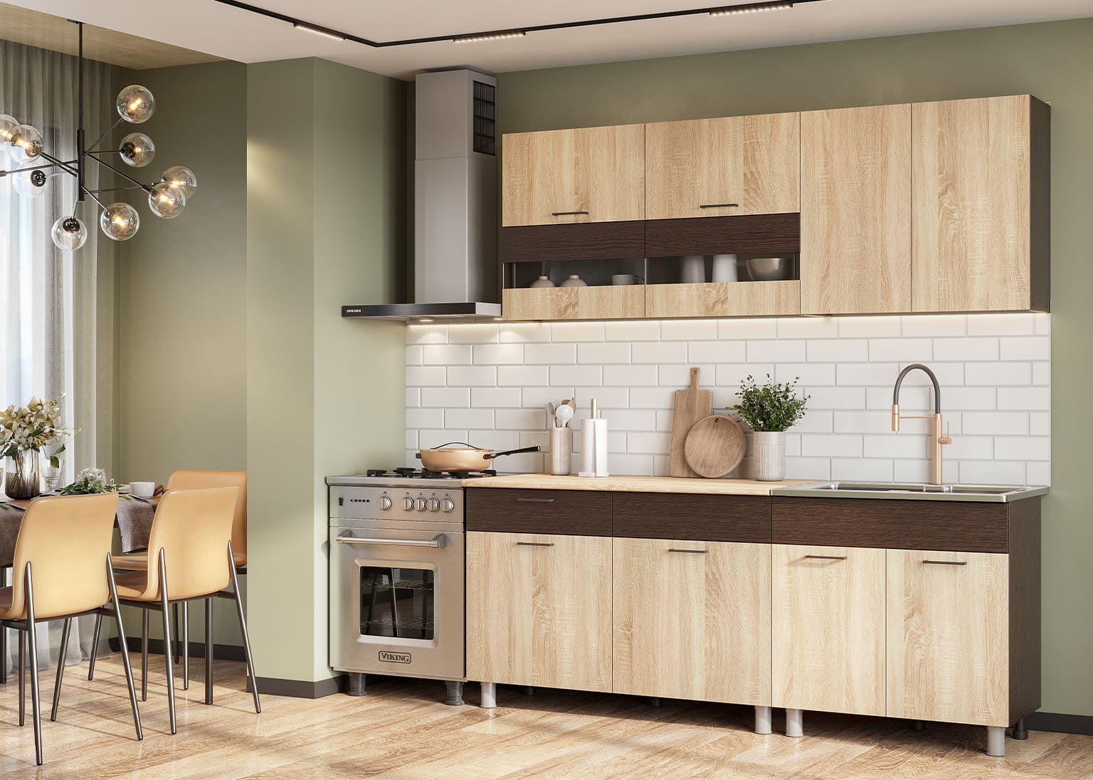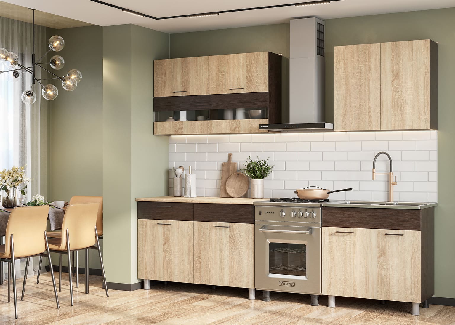 Кухня «Босфор» представляет собой готовый кухонный гарнитур длиной 2000 мм, который станет идеальным решением для вашего дома. В комплекте идет столешница толщиной 26 мм, выполненная в цвете «Дуб Сонома», что добавляет теплоты и уюта в интерьер.