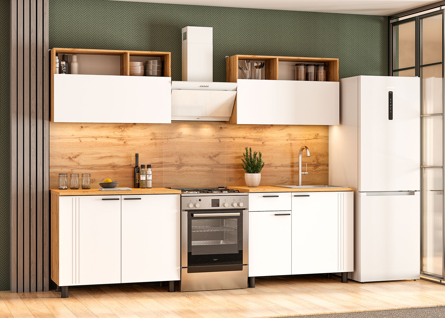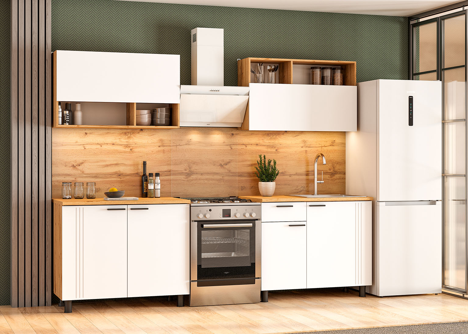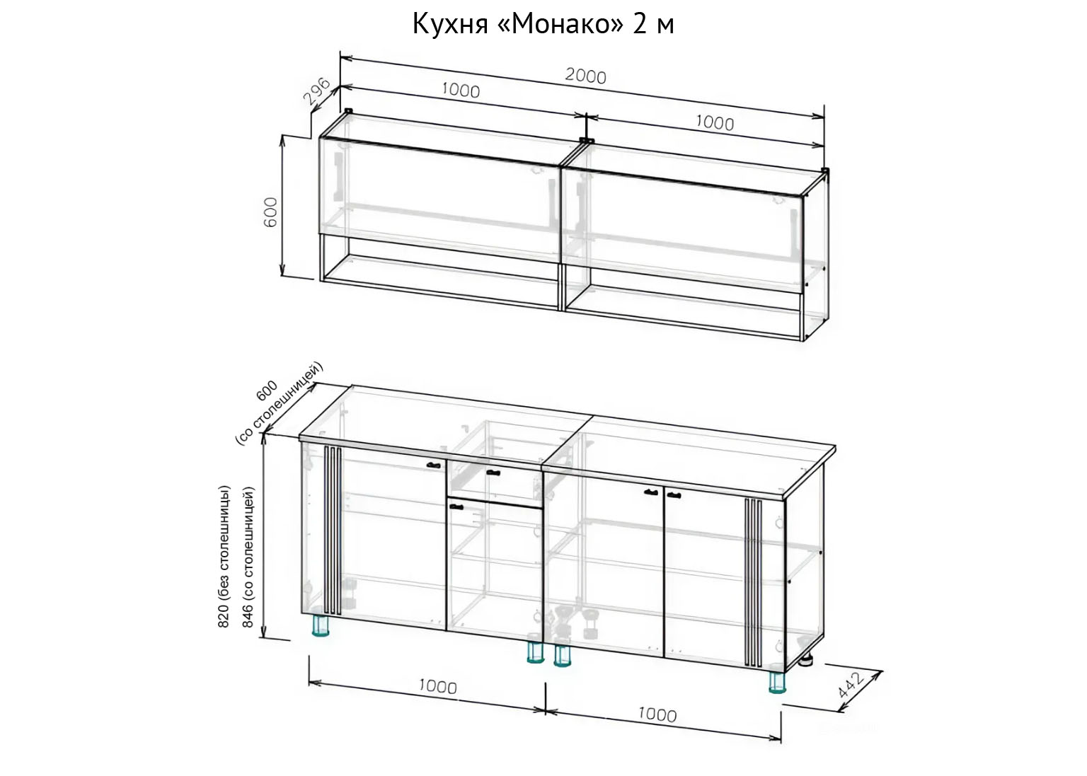 Кухня «Монако» Белая — это готовый комплект мебели для кухни длиной 2 метра. Фасад выполнен из МДФ.