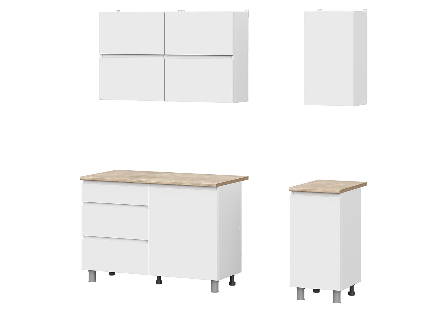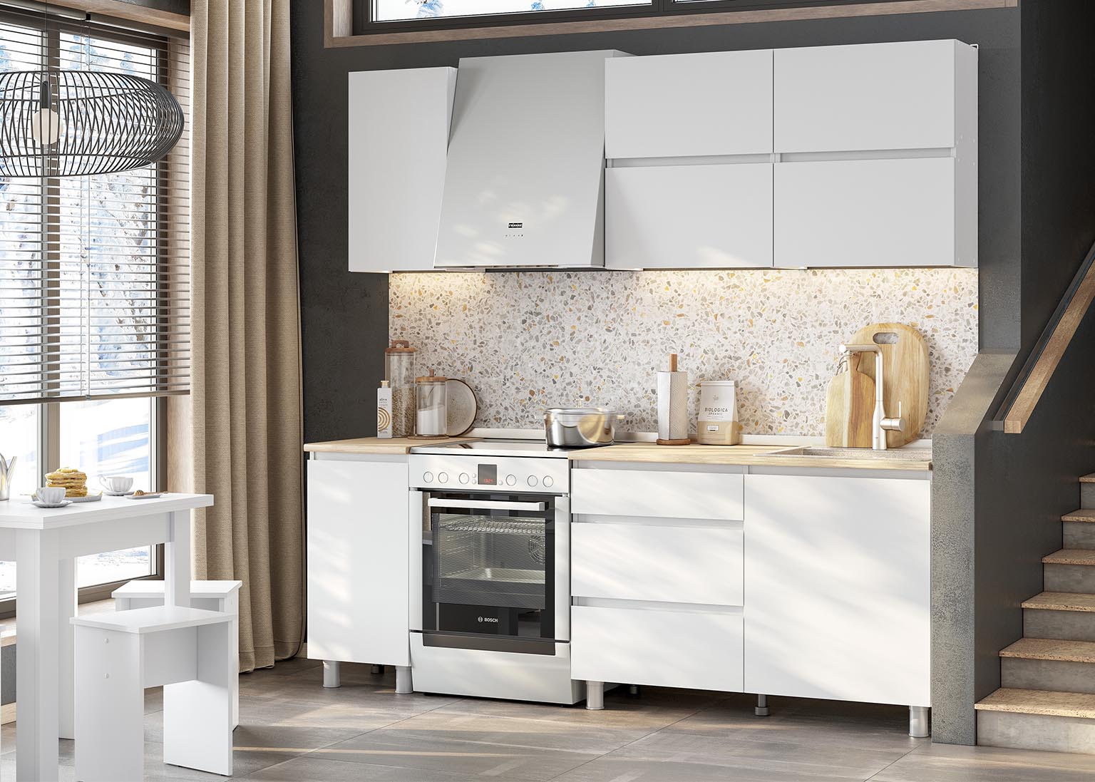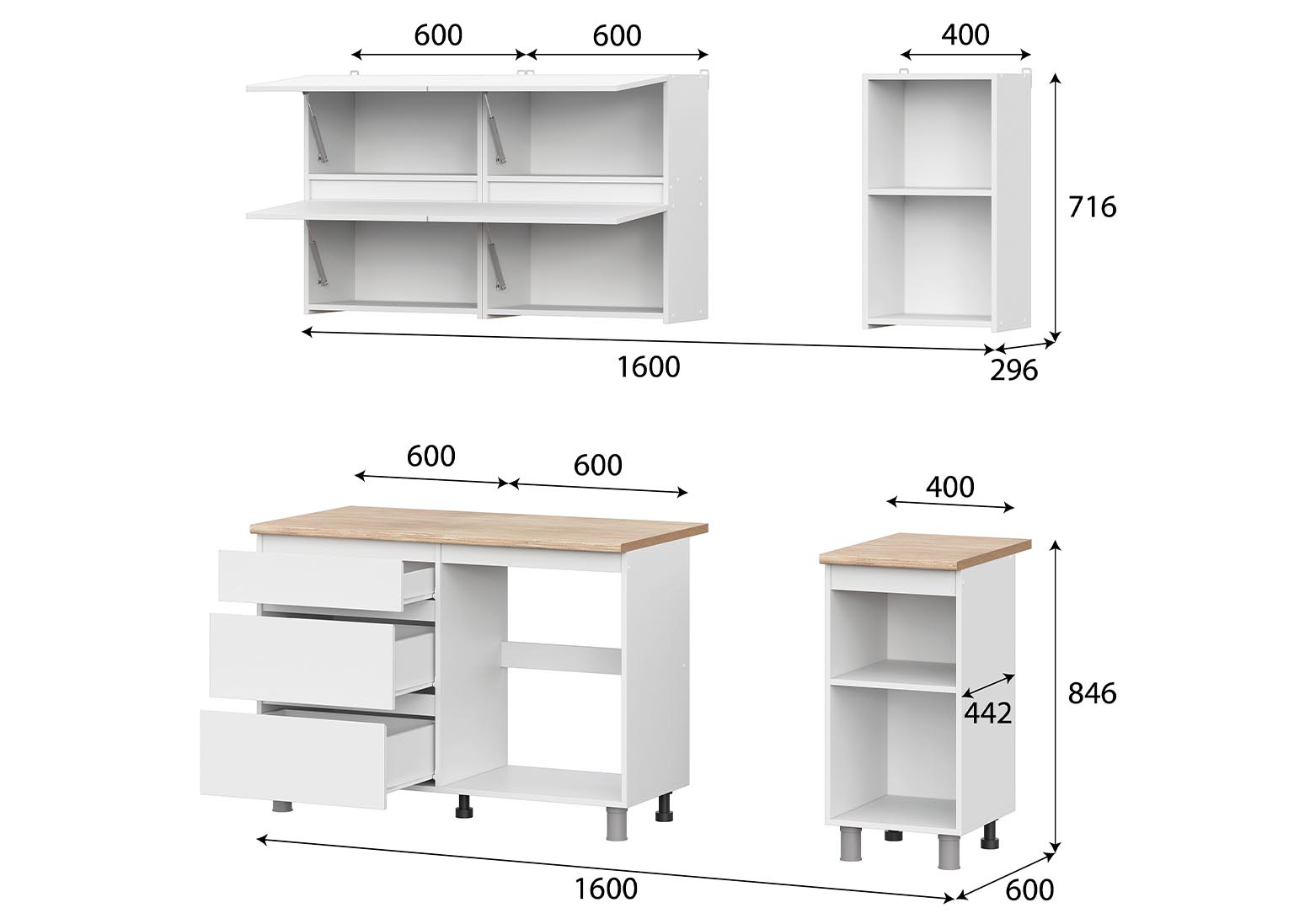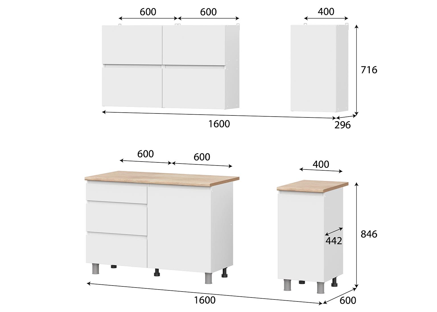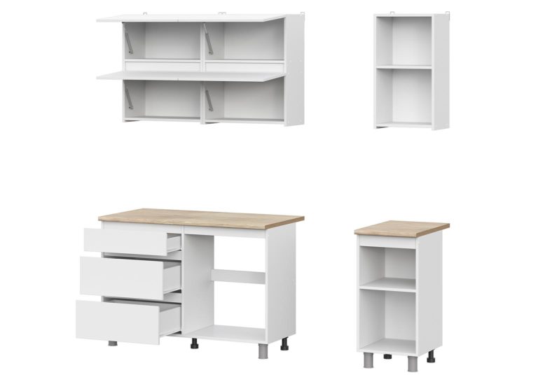 Кухня «Токио» 1,6 м — готовая кухня в белом цвете со столешницей. Кухонный гарнитур не имеет ручек, их роль выполняют скосы под 45 градусов на нижних модулях и выступы на фасадах навесных шкафов. Это позволяет сэкономить пространство, а также придаёт кухне более целостный вид.