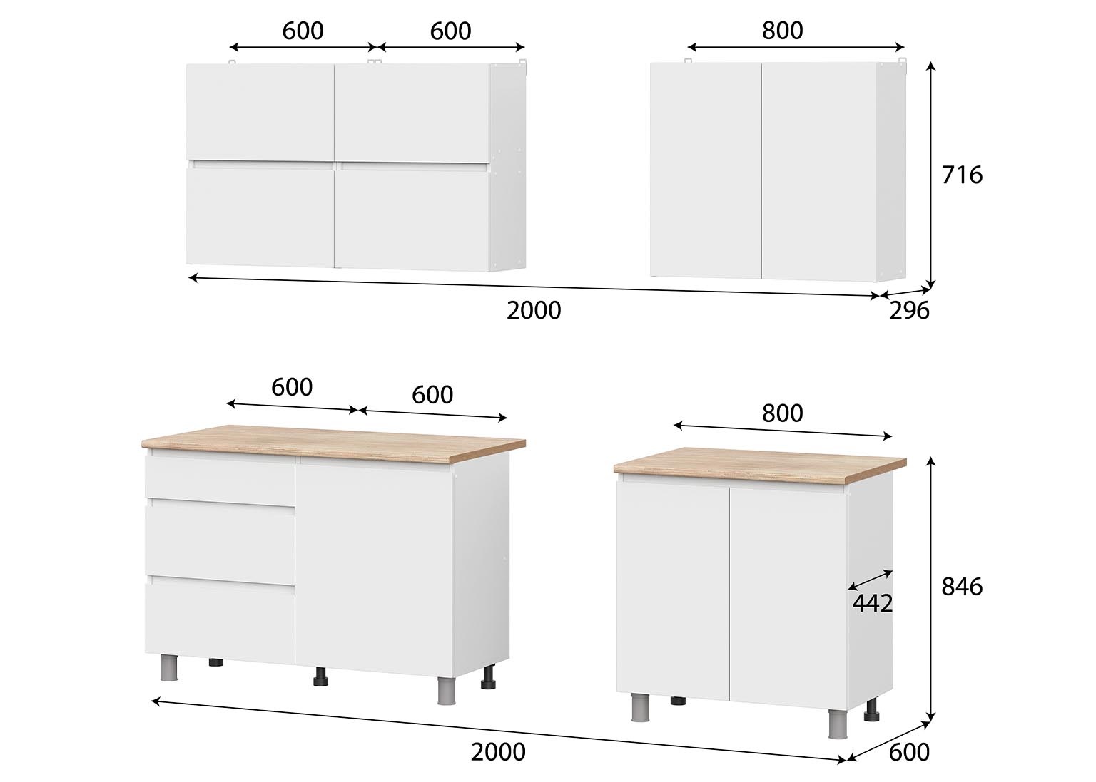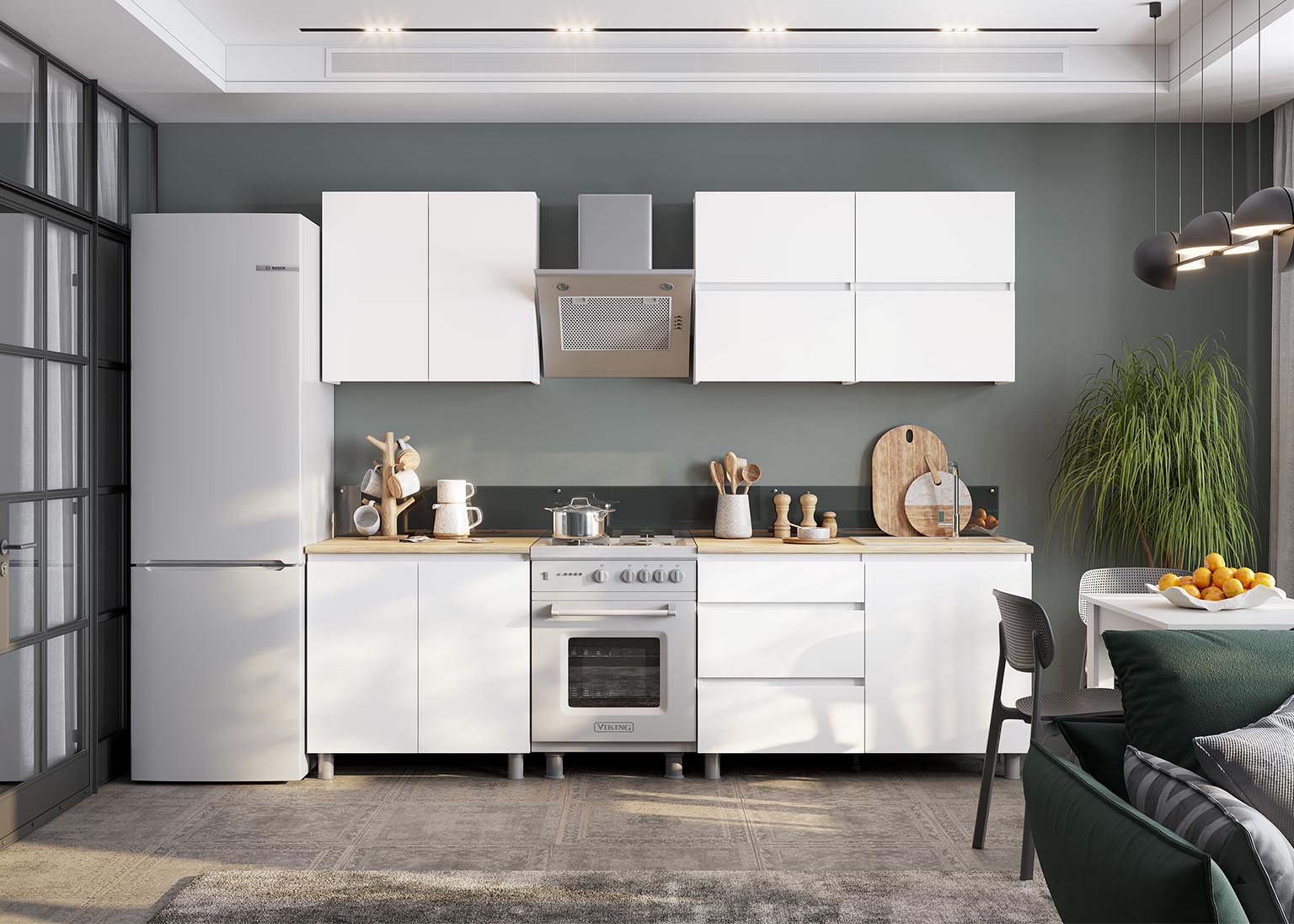 Кухня «Токио» 2 м — готовая кухня в белом цвете со столешницей. Кухонный гарнитур не имеет ручек, их роль выполняют скосы под 45 градусов на нижних модулях и выступы на фасадах навесных шкафов. Это позволяет сэкономить пространство, а также придаёт кухне более целостный вид.