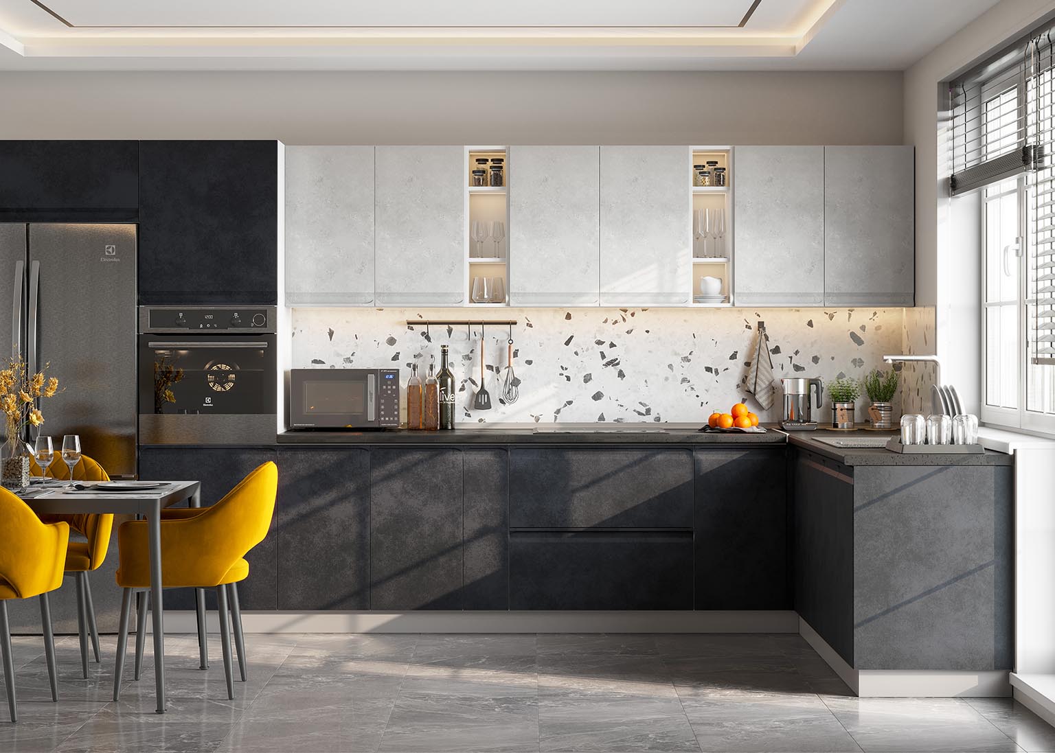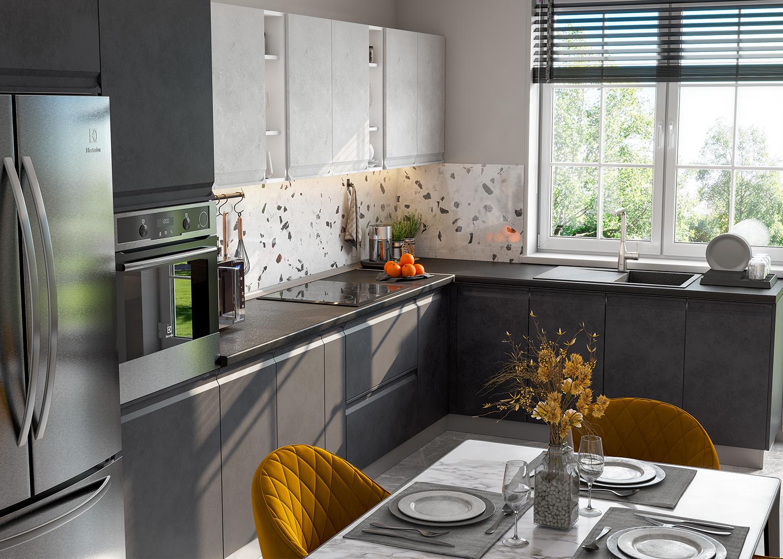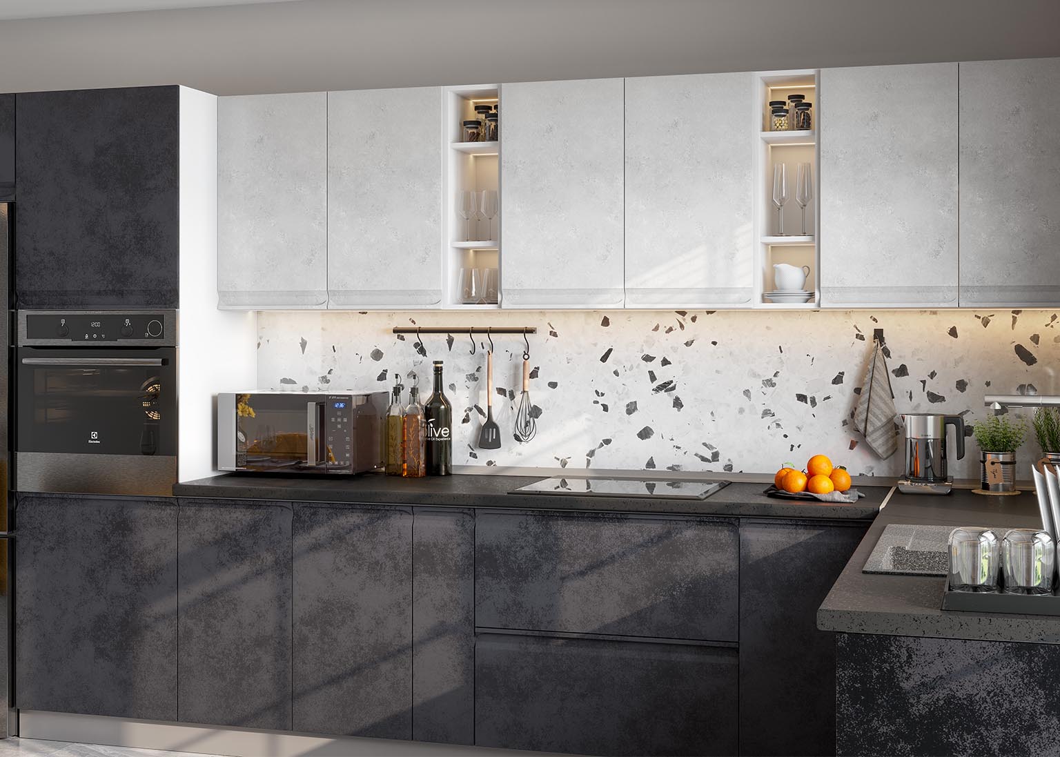 Модульная кухня «Вельвет» — популярное решение в этом сезоне, которое использует имитацию шлифованного бетона и матовый эффект. Всё это подчеркивает современный стиль, придаёт солидность и индивидуальность.