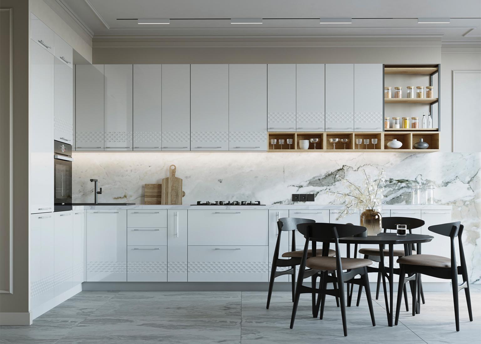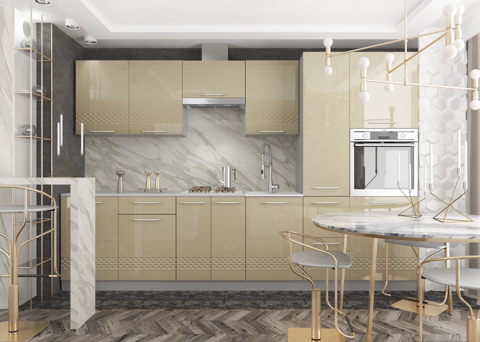 Модульная кухня «Капля» – современное и доступное решение для вашего дома. Стильные фасады с изысканным орнаментом придают кухне элегантный вид, делая её центральным элементом интерьера.