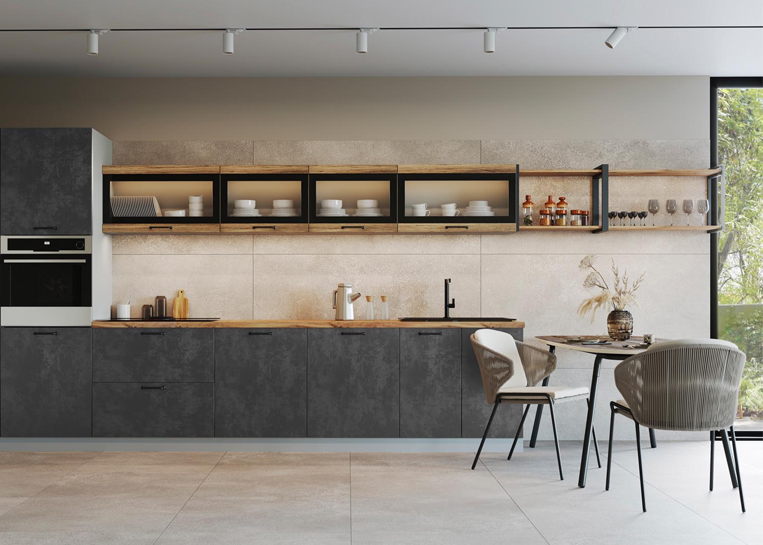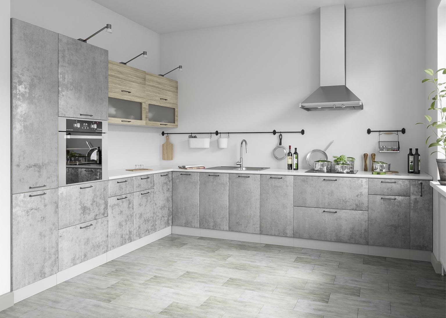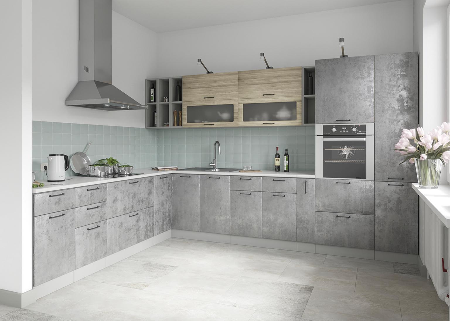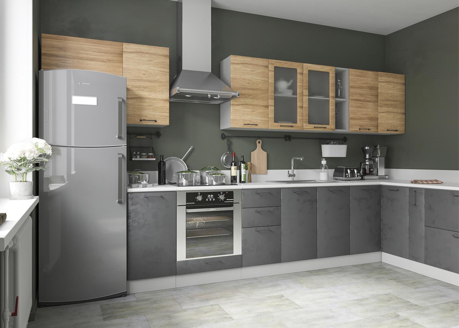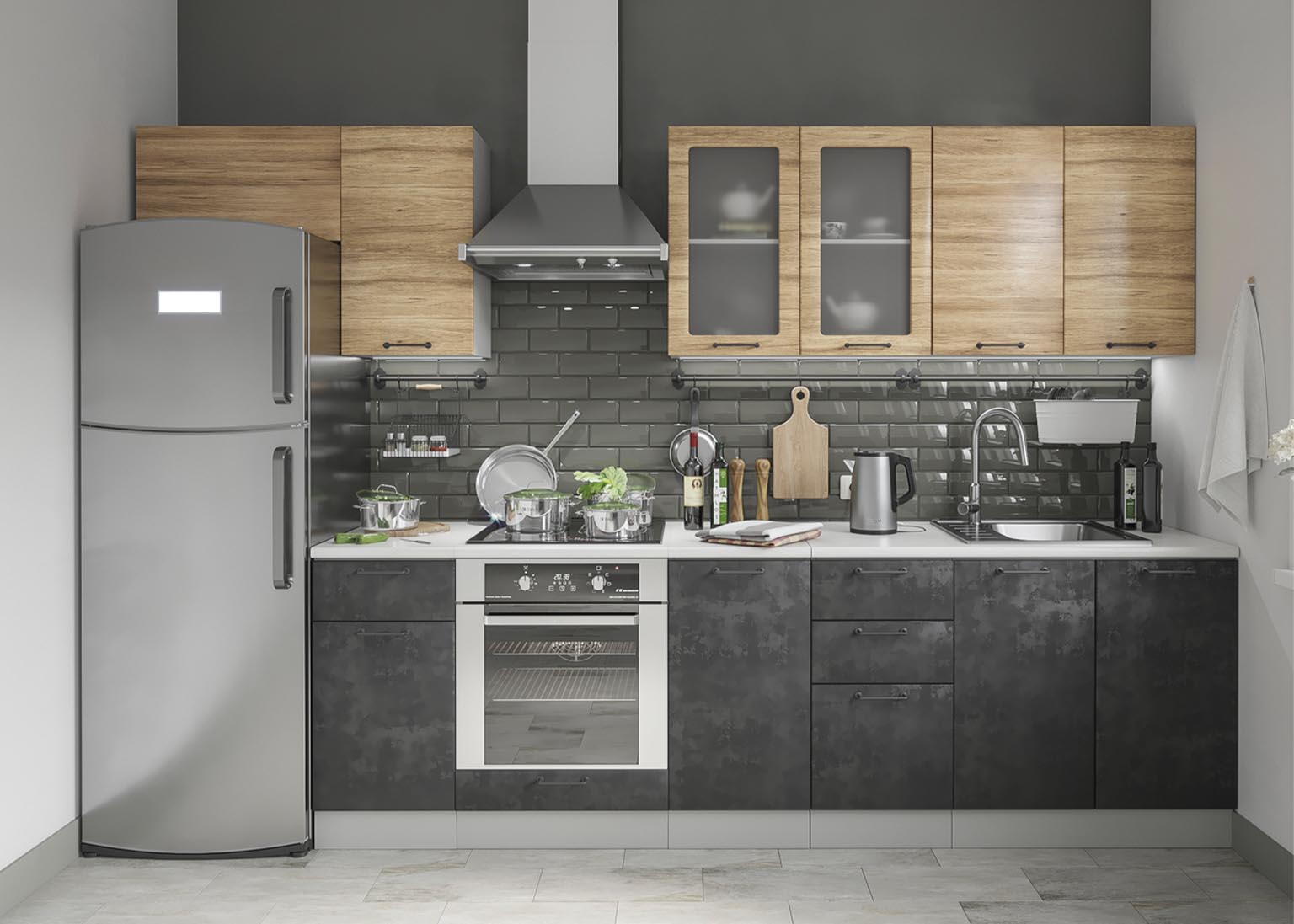 Матовые стеклянные дверцы и геометрические ручки создают правильную атмосферу, а деревянные фасады добавляют мягкости. Все оттенки, включая бетон и «Дуб майский», соответствуют выбранной стилистике.