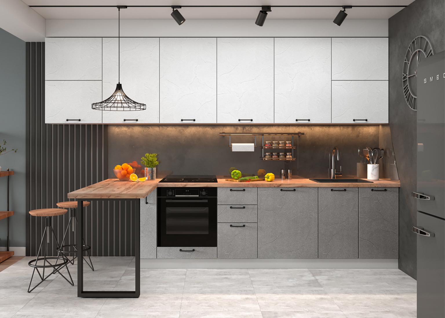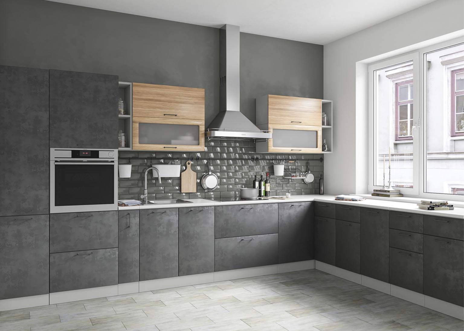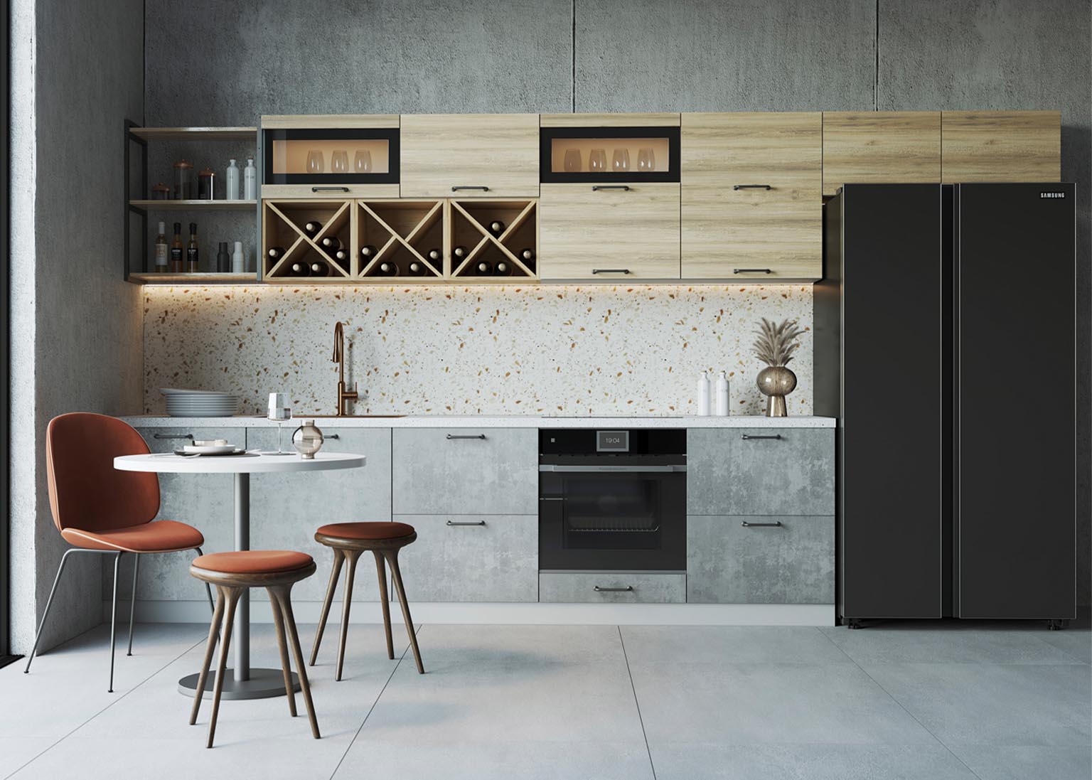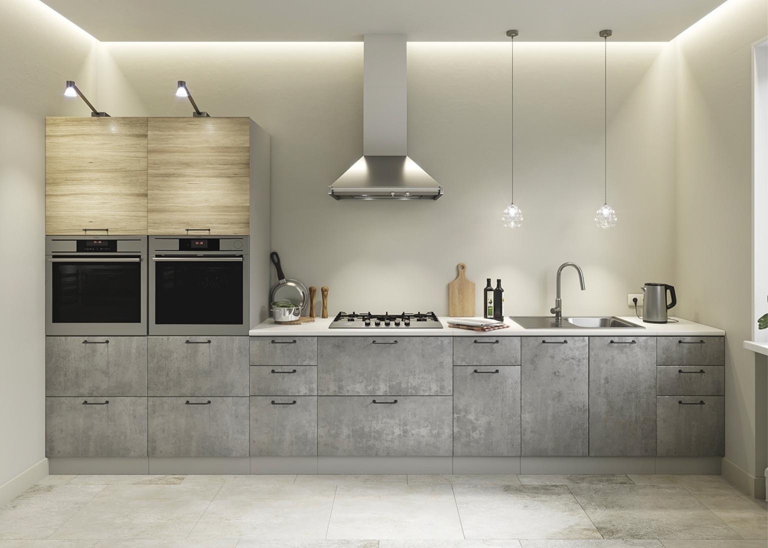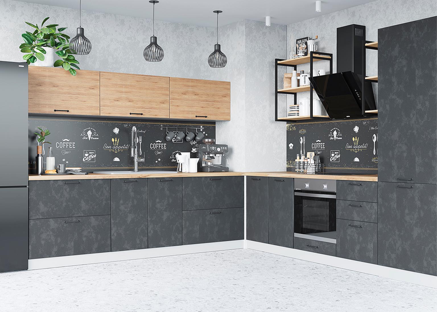 Матовые стеклянные дверцы и геометрические ручки создают правильную атмосферу, а деревянные фасады добавляют мягкости. Все оттенки, включая бетон и «Дуб майский», соответствуют выбранной стилистике.