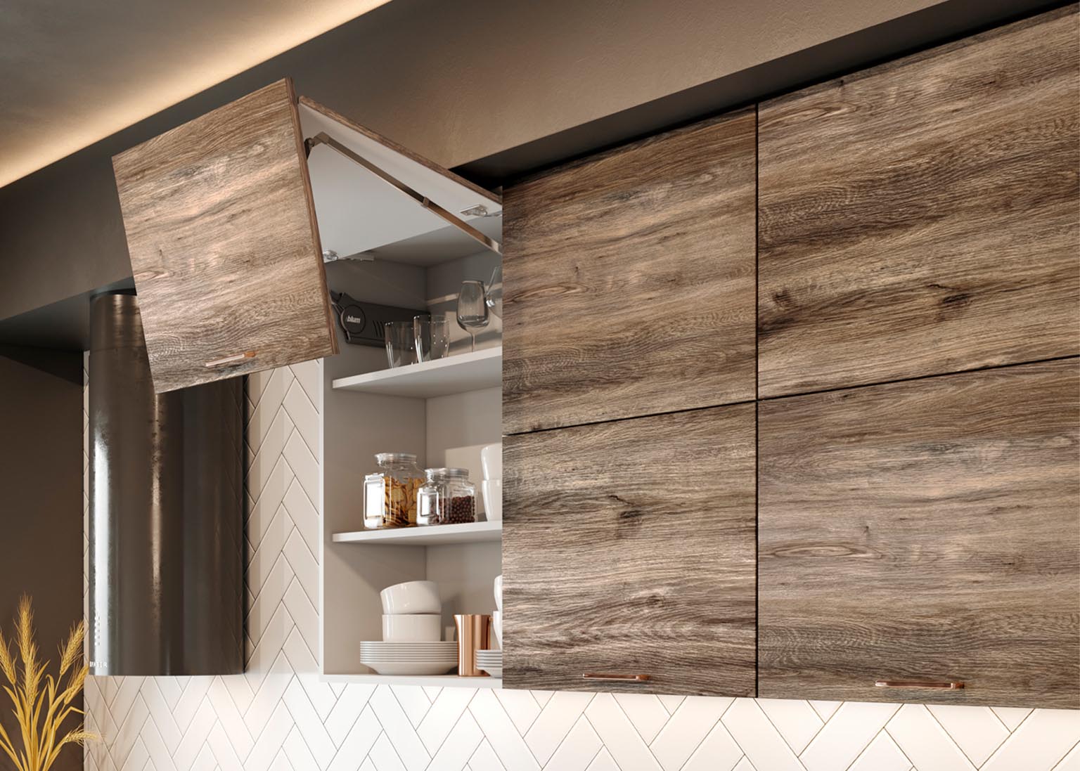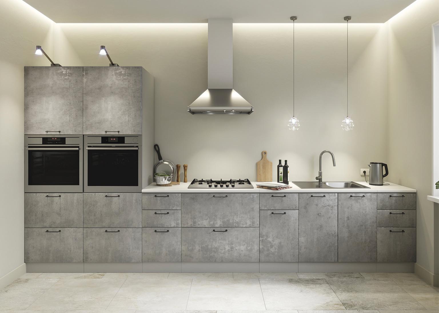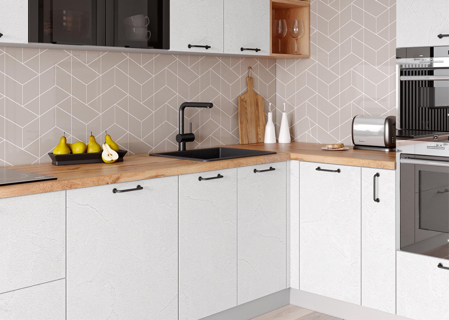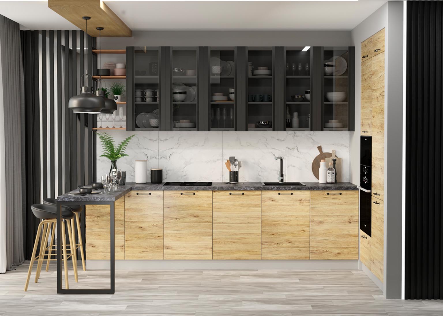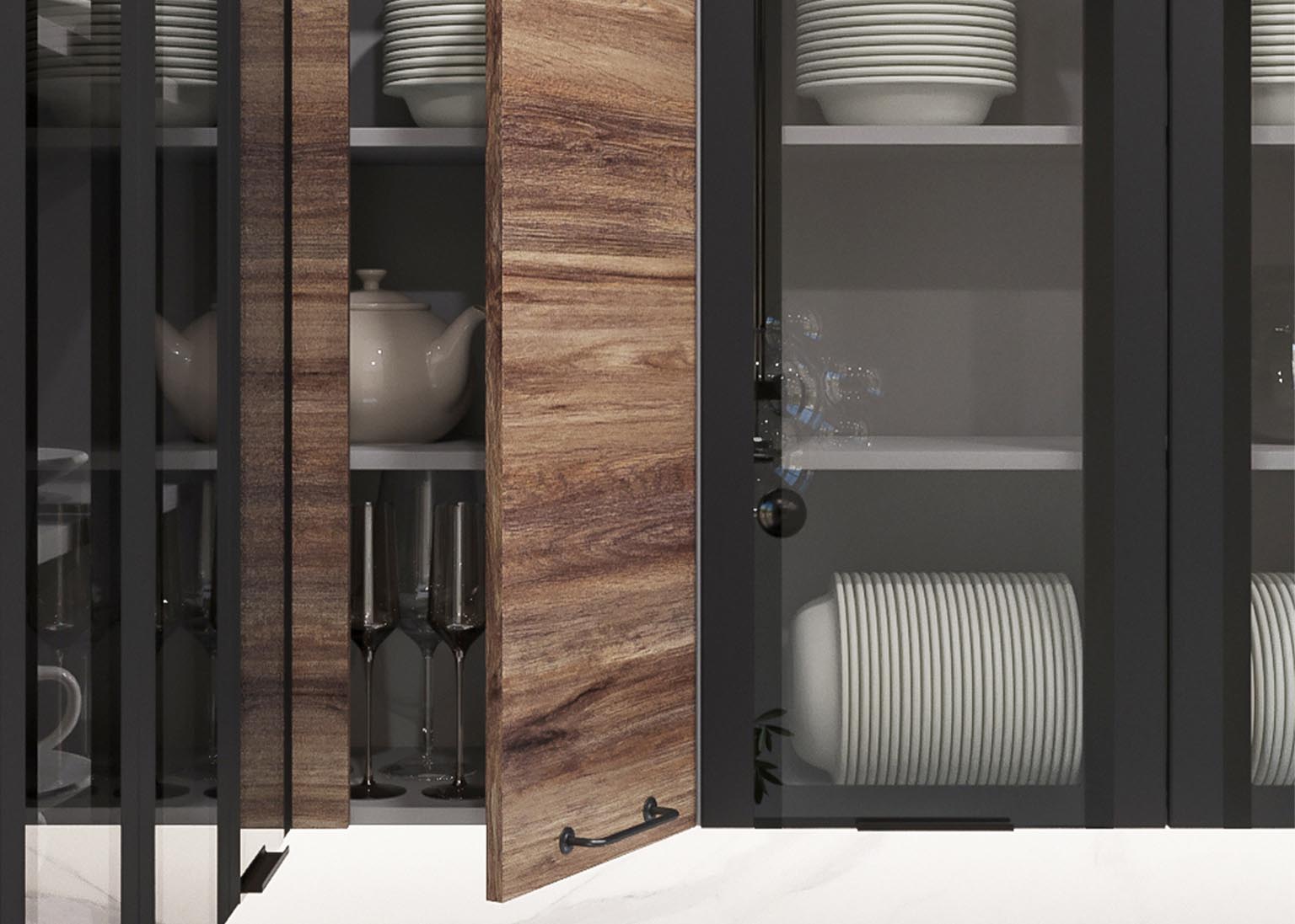 Матовые стеклянные дверцы и геометрические ручки создают правильную атмосферу, а деревянные фасады добавляют мягкости. Все оттенки, включая бетон и «Дуб майский», соответствуют выбранной стилистике.