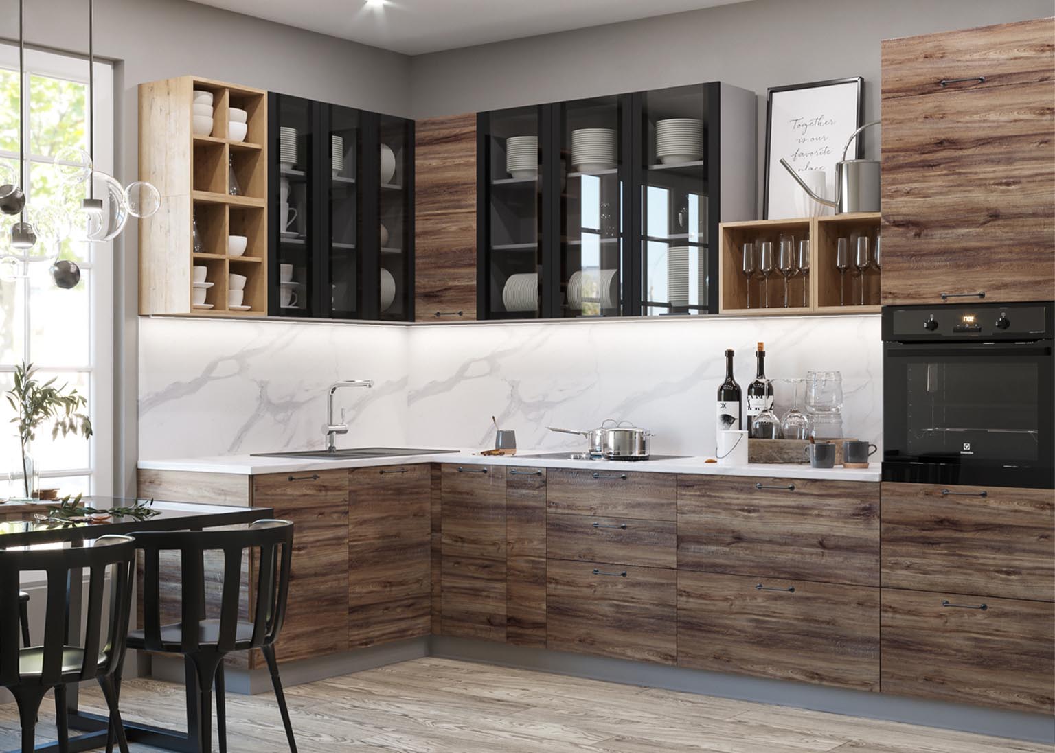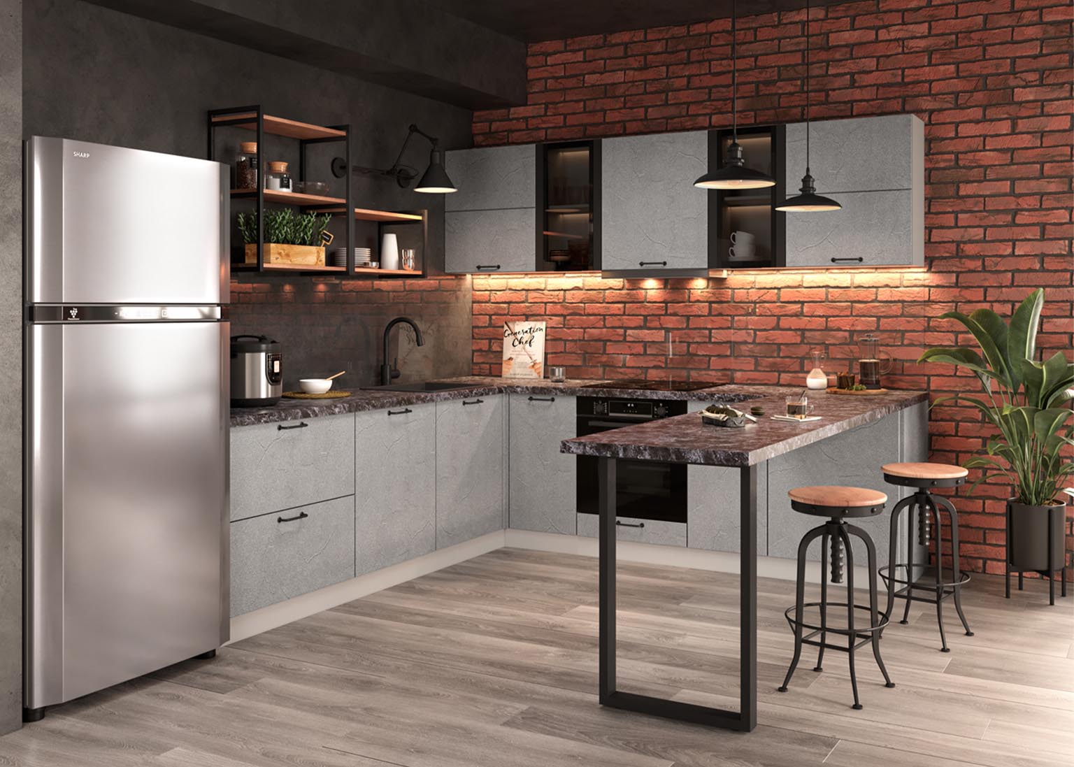 Модульная кухня «Лофт» имеет шкафы в стильной цветовой гамме, которые прекрасно сочетаются с открытым бетоном и придают индустриальной обстановке нотку элегантной современности. Вы можете выбрать оттенки фасадов, учитывая освещение и размер помещения: тёмные фасады, такие как «Дуб бурый», идеально подходят для больших пространств, а светлые, как «Дуб майский», — для маленьких кухонь.