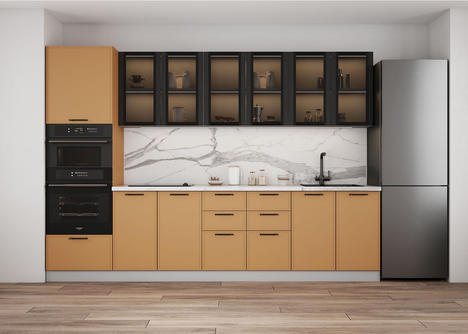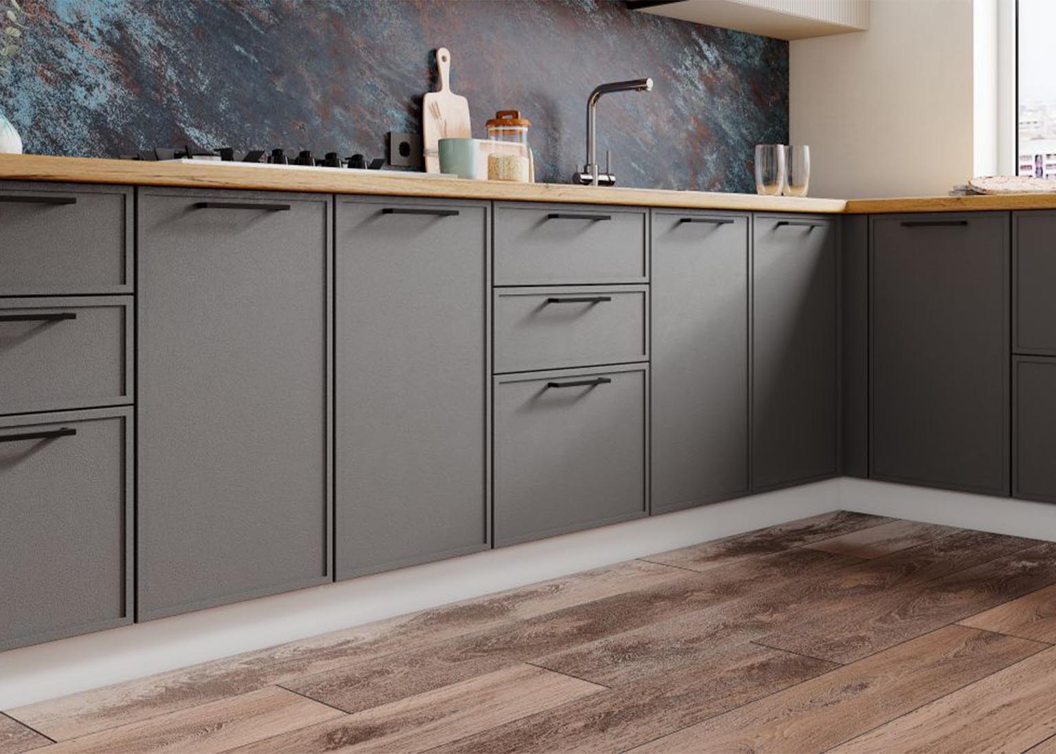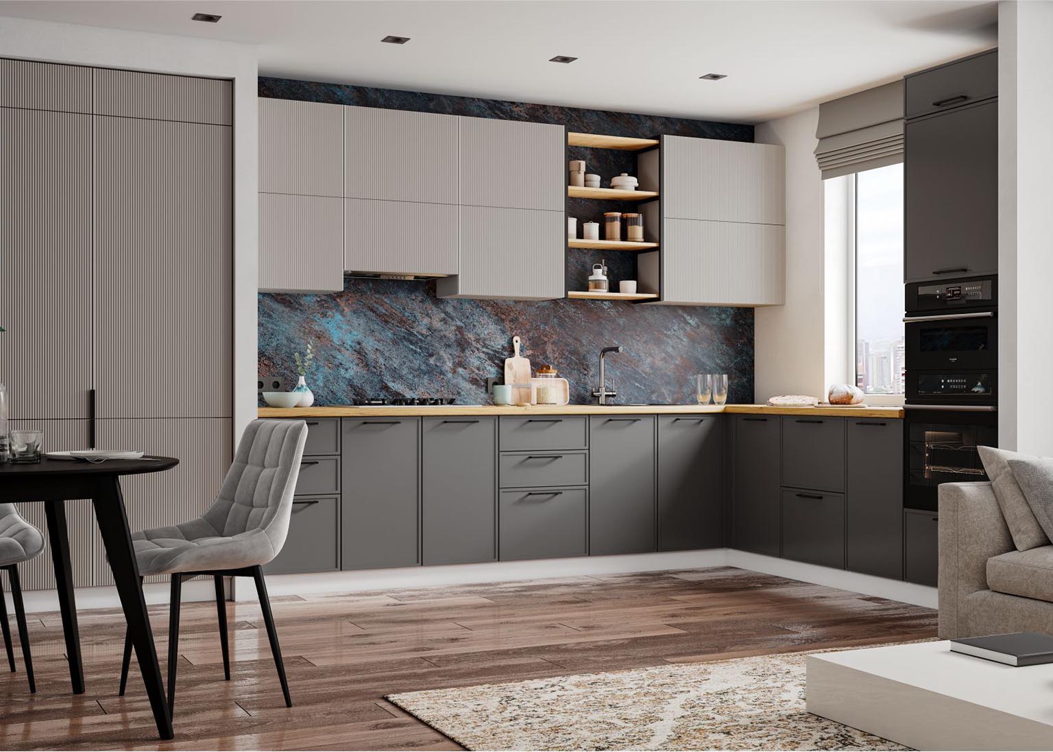 Модульная кухня «Марта» — идеальное сочетание элегантности и функциональности. Необычные фасады толщиной 19 мм с благородной текстурой «Кожа» придают вашей кухне стильный и современный вид, который выделяется среди аналогов.