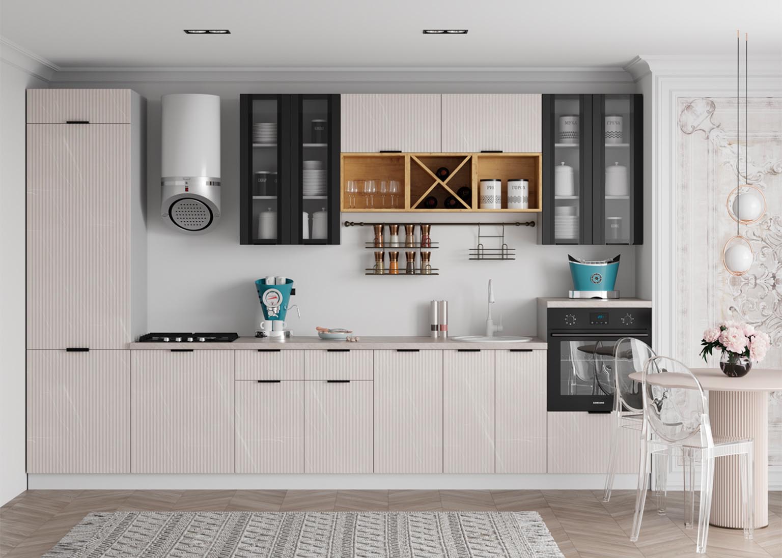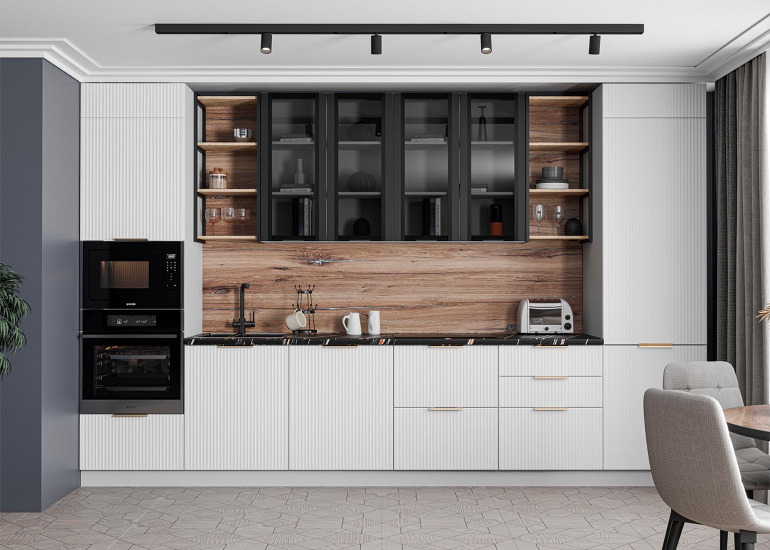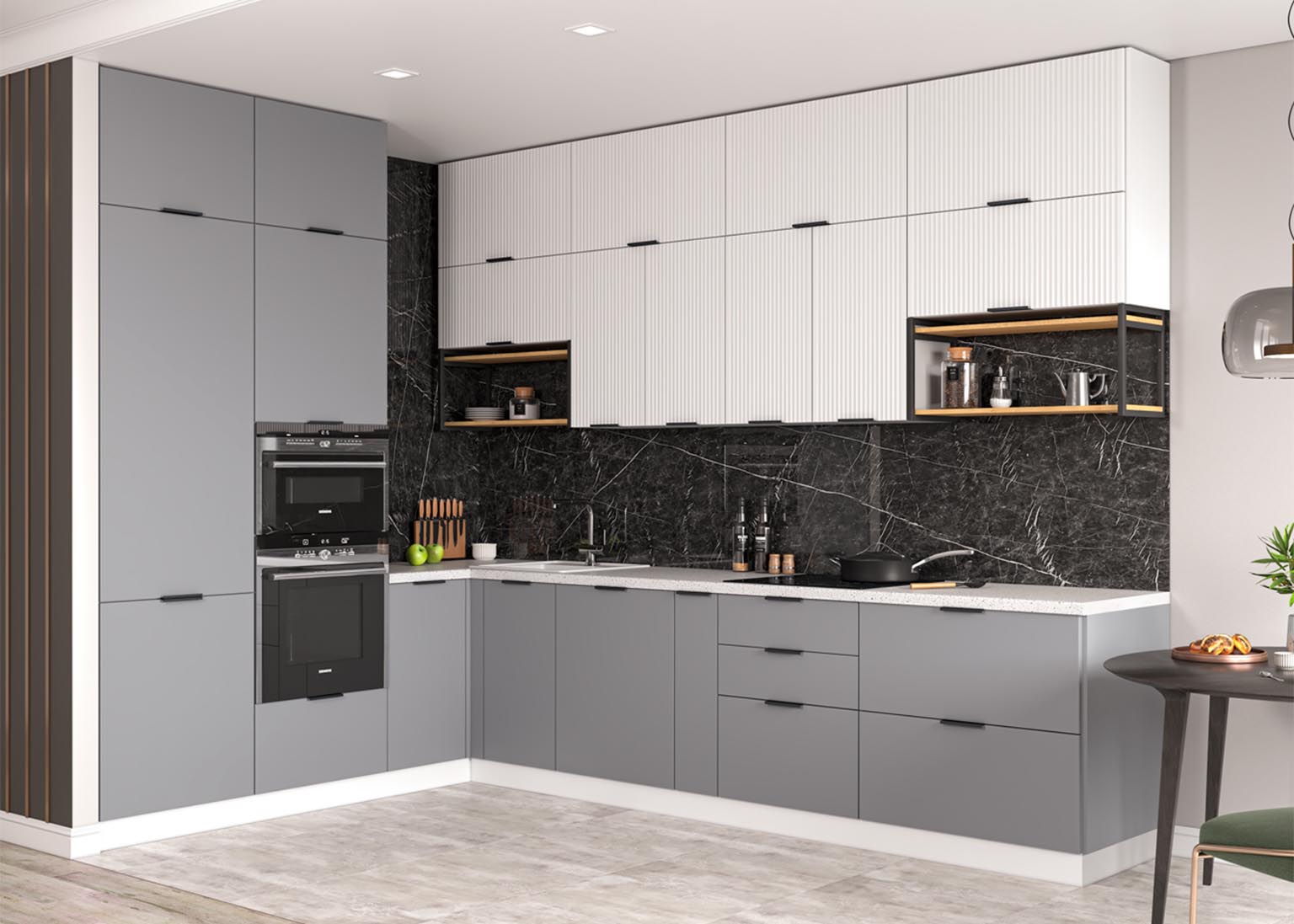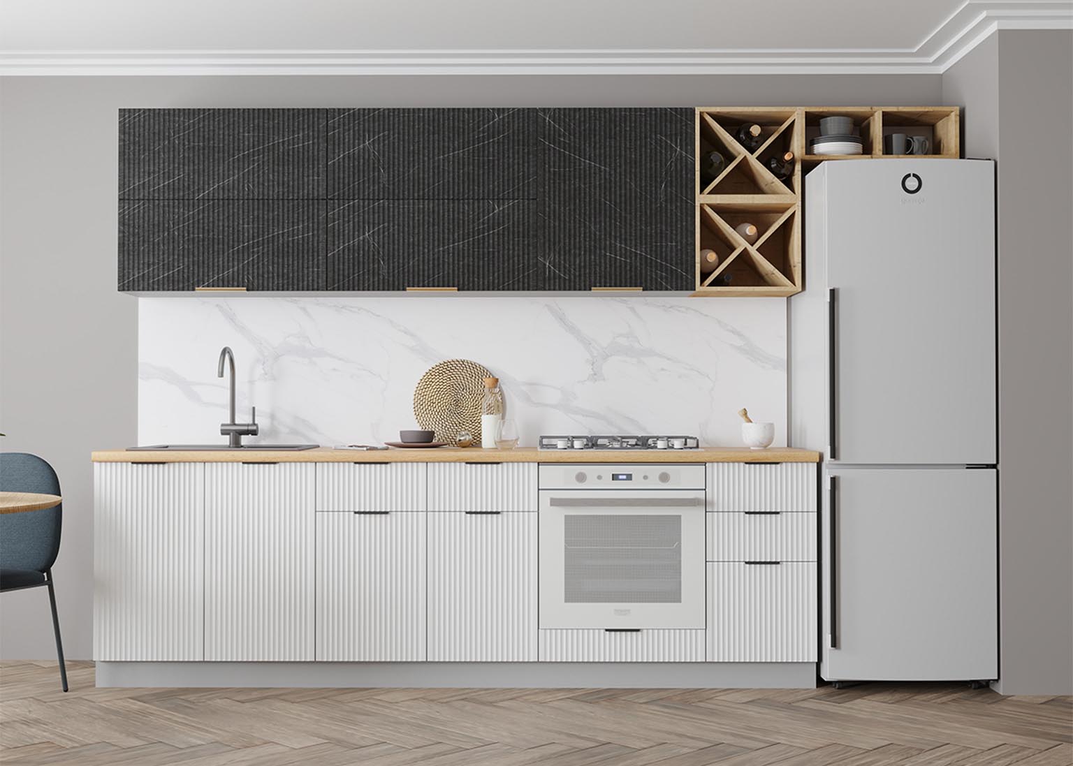 - Элегантность и строгость: Вертикальная фрезеровка фасадов создает рельеф, который задает интерьеру необходимый ритм и выглядит благородно в лучших традициях итальянского стиля.