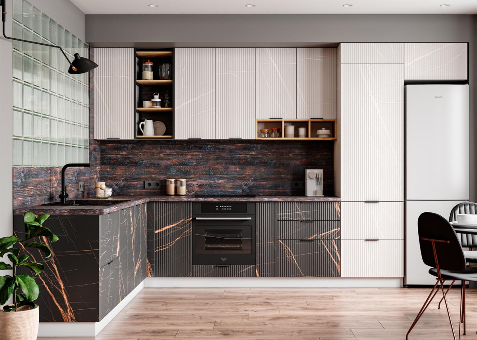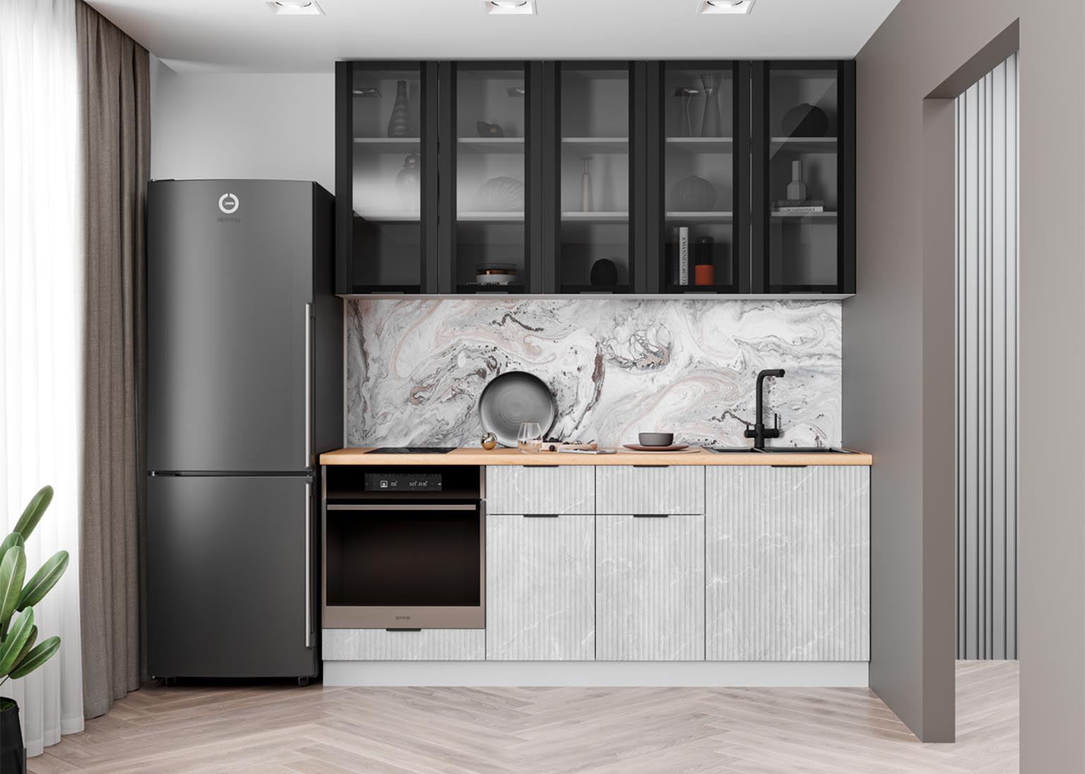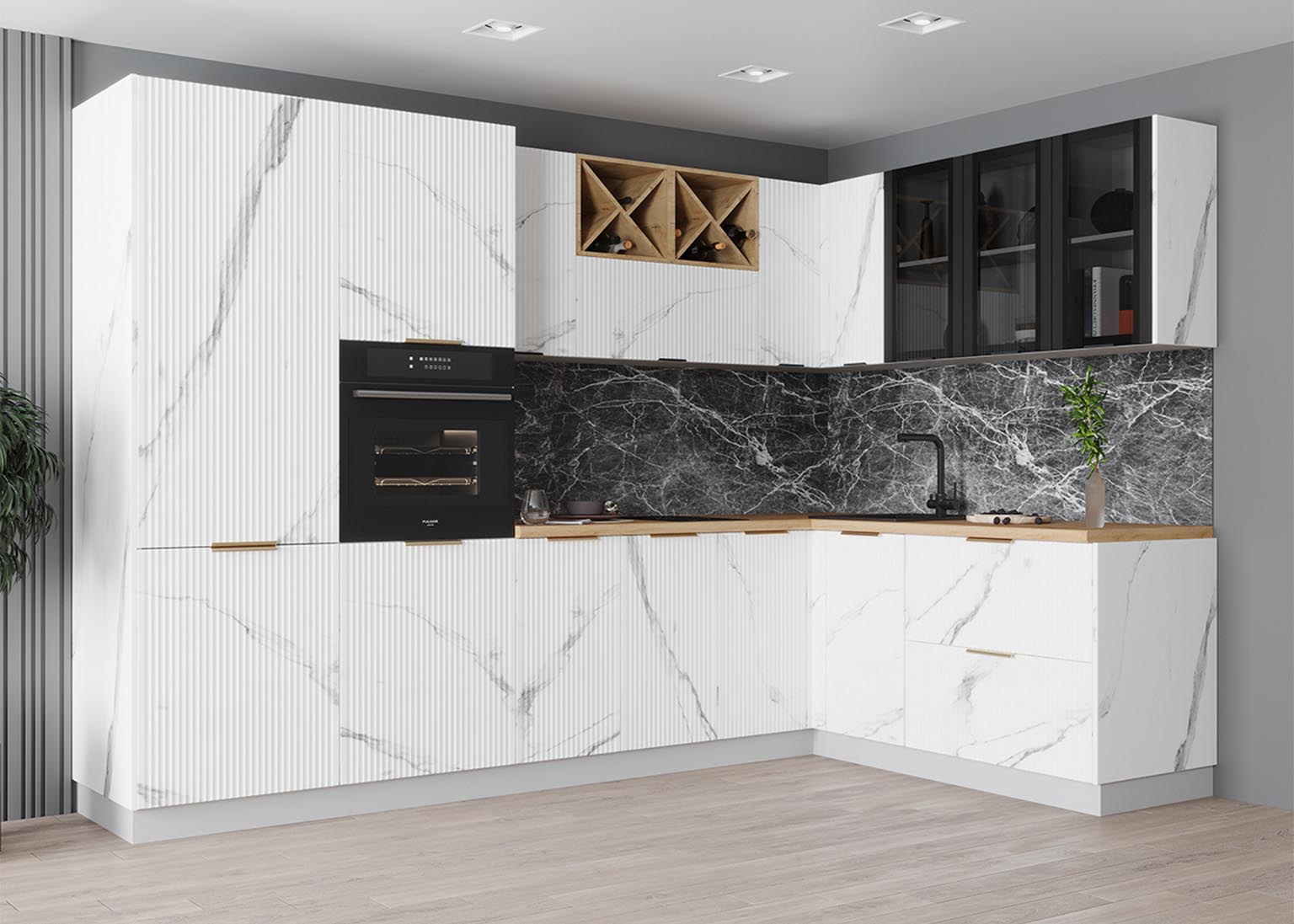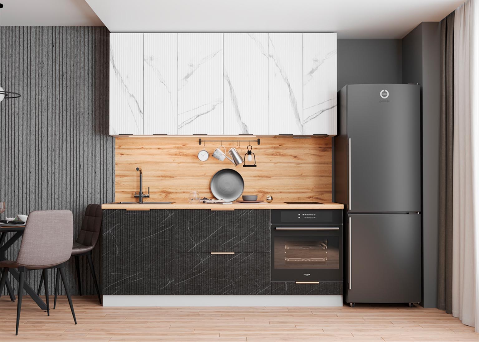 - Элегантность и строгость: Вертикальная фрезеровка фасадов создает рельеф, который задает интерьеру необходимый ритм и выглядит благородно в лучших традициях итальянского стиля.