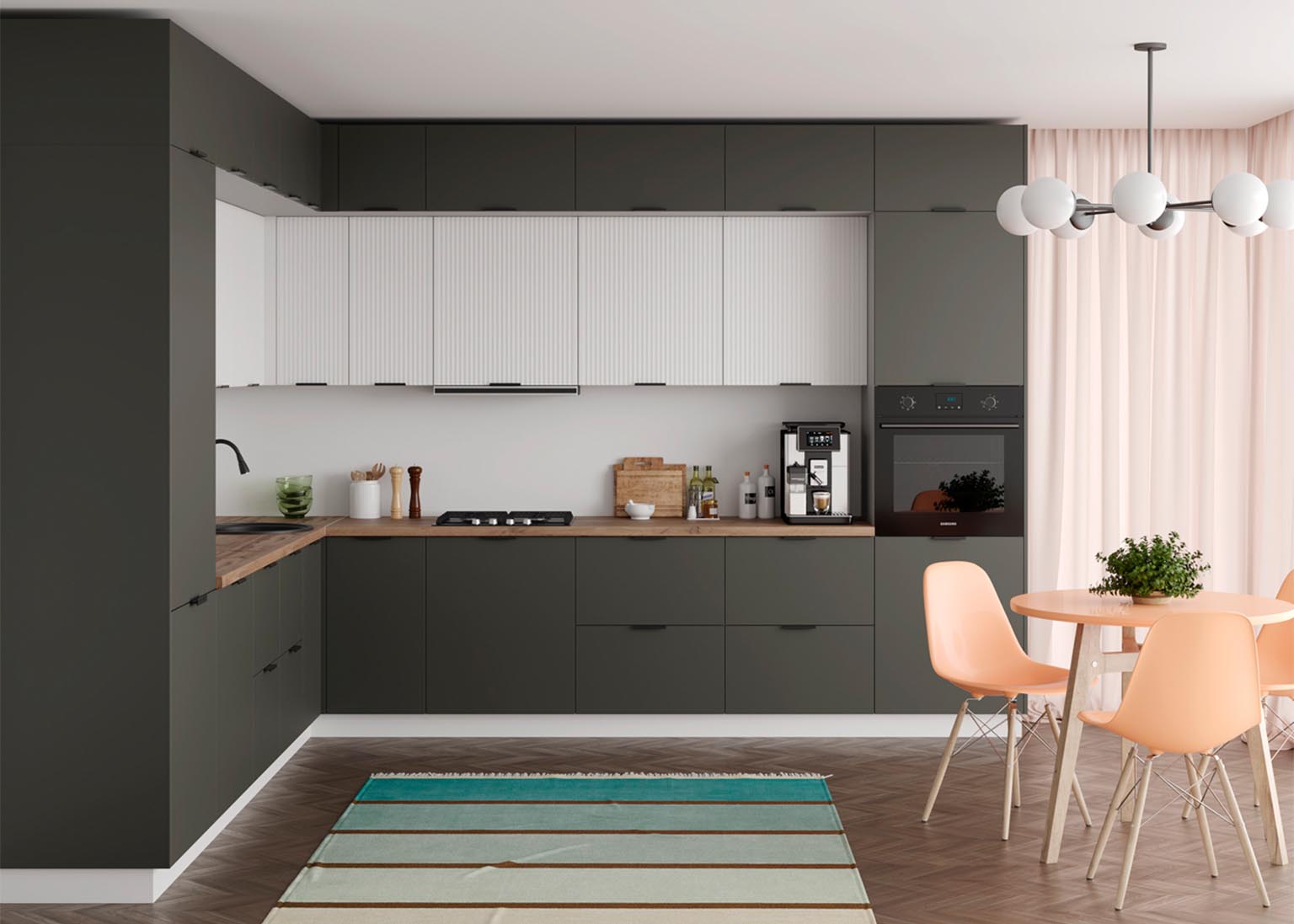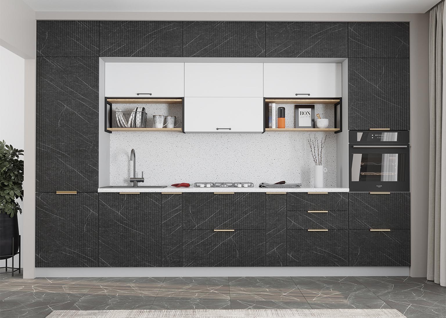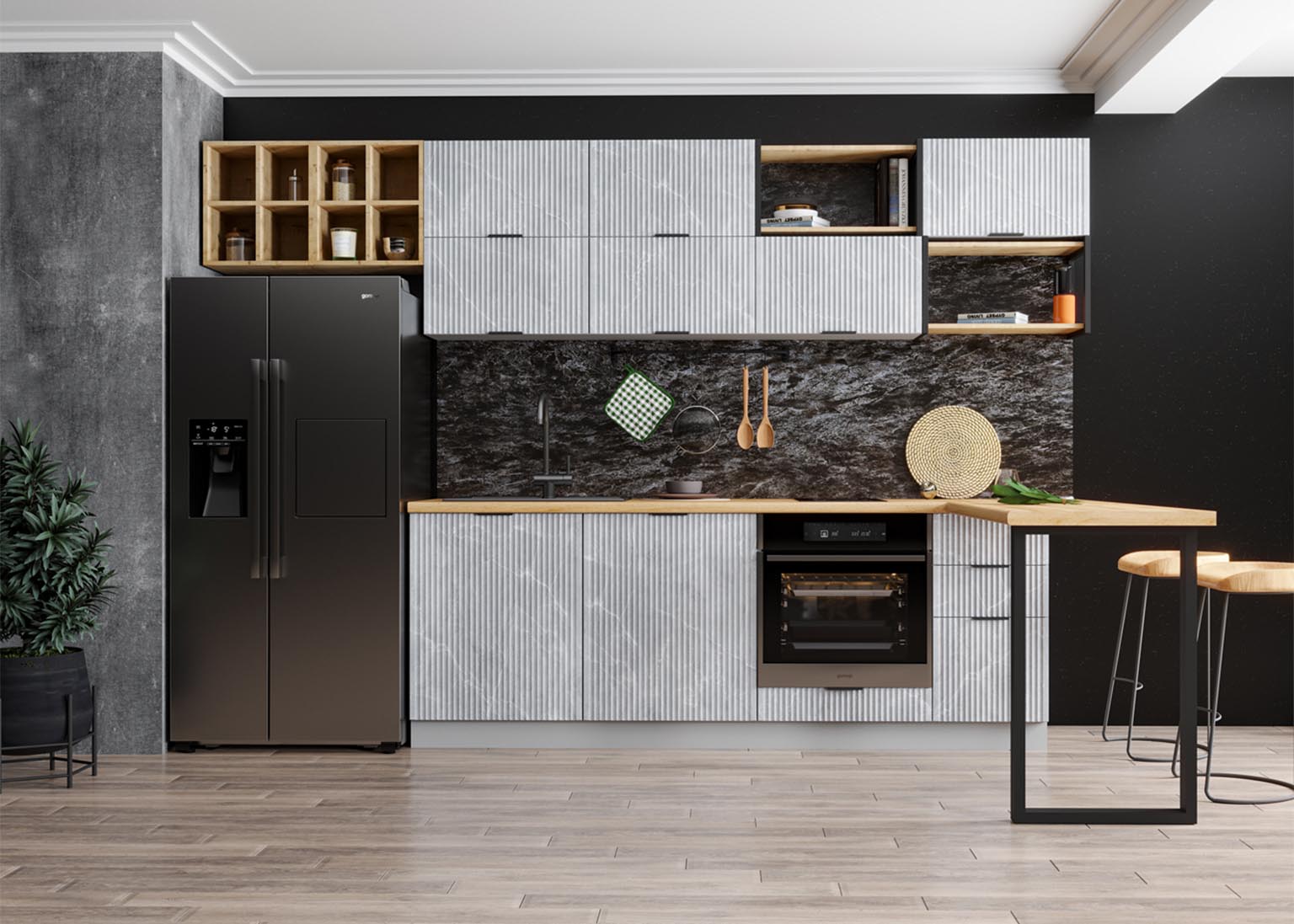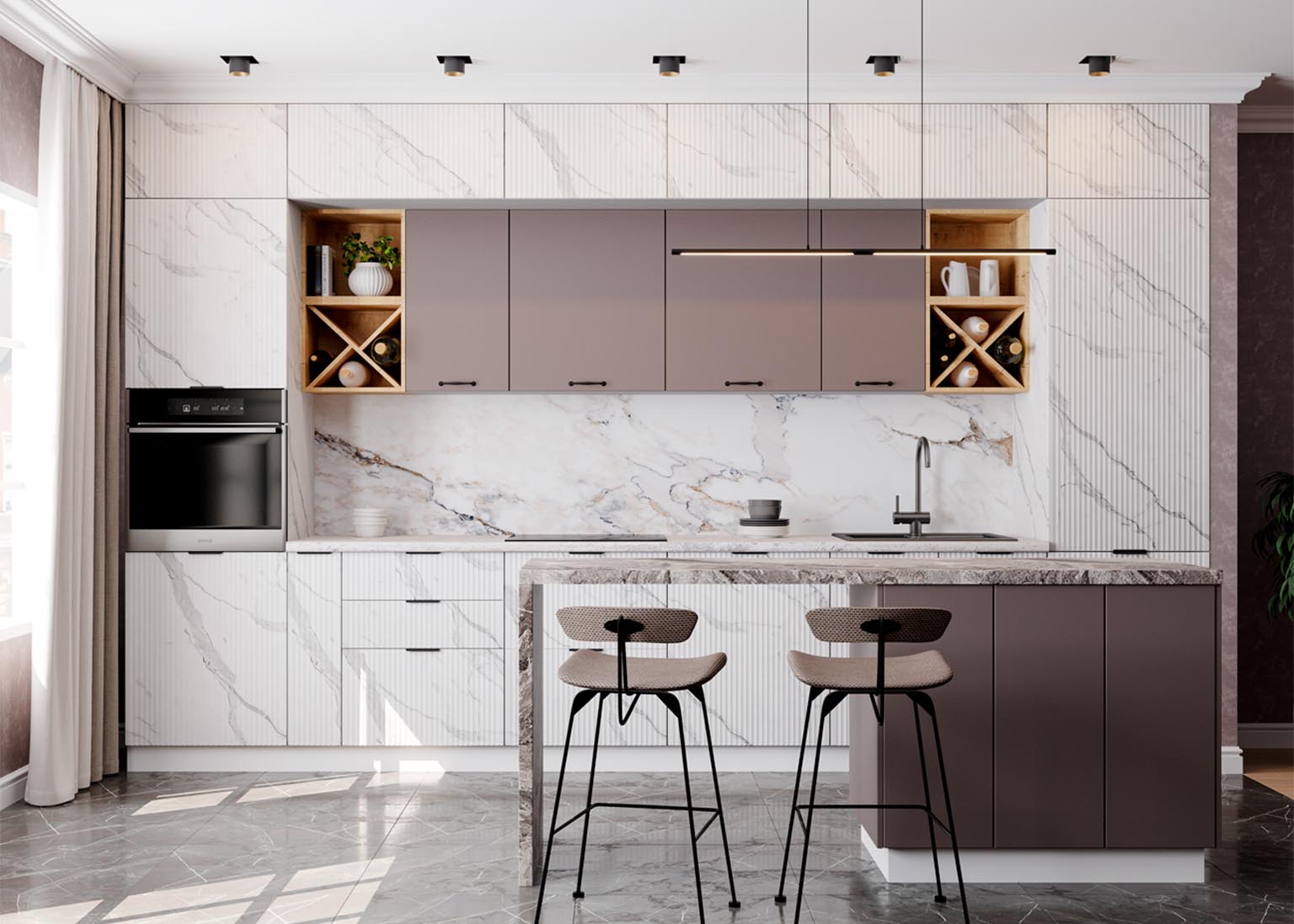 - Элегантность и строгость: Вертикальная фрезеровка фасадов создает рельеф, который задает интерьеру необходимый ритм и выглядит благородно в лучших традициях итальянского стиля.