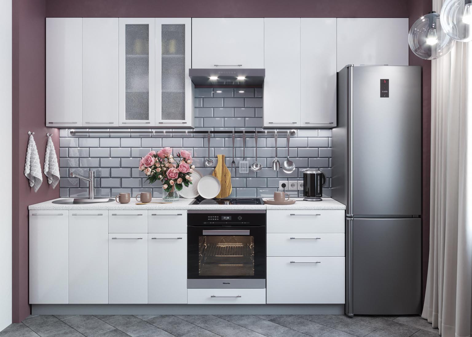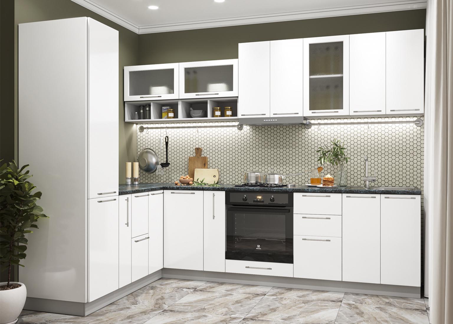 Фасады светлых оттенков и открытые полки углового варианта придают кухне дополнительную лёгкость. Вставки из матового стекла смягчают блеск глянца, добавляя фасадам благородный вид.