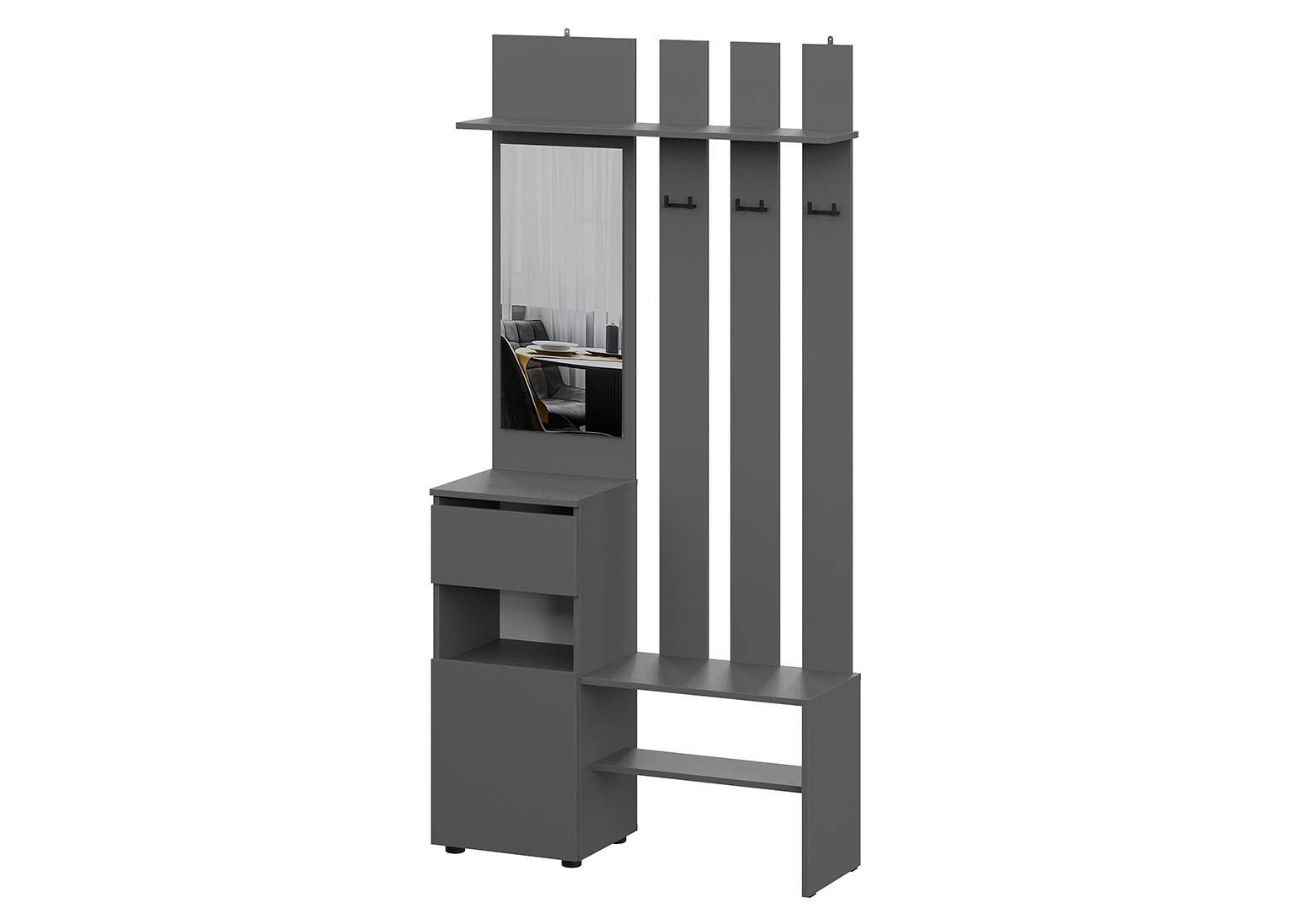 В комплекте имеются плоские навесы для обязательного надёжного крепления зеркала и вешалки к стене. Вешалка имеет выдвижной ящик, который оснащён роликовыми направляющими.