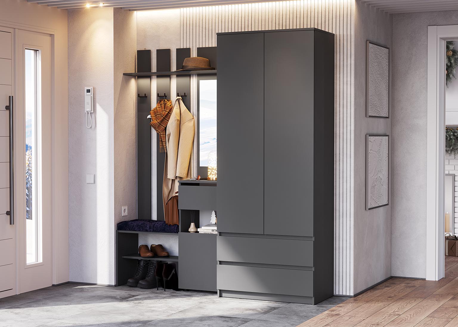 В стоимость прихожей «Денвер» входят Вешалка с зеркалом и Шкаф двухстворчатый.