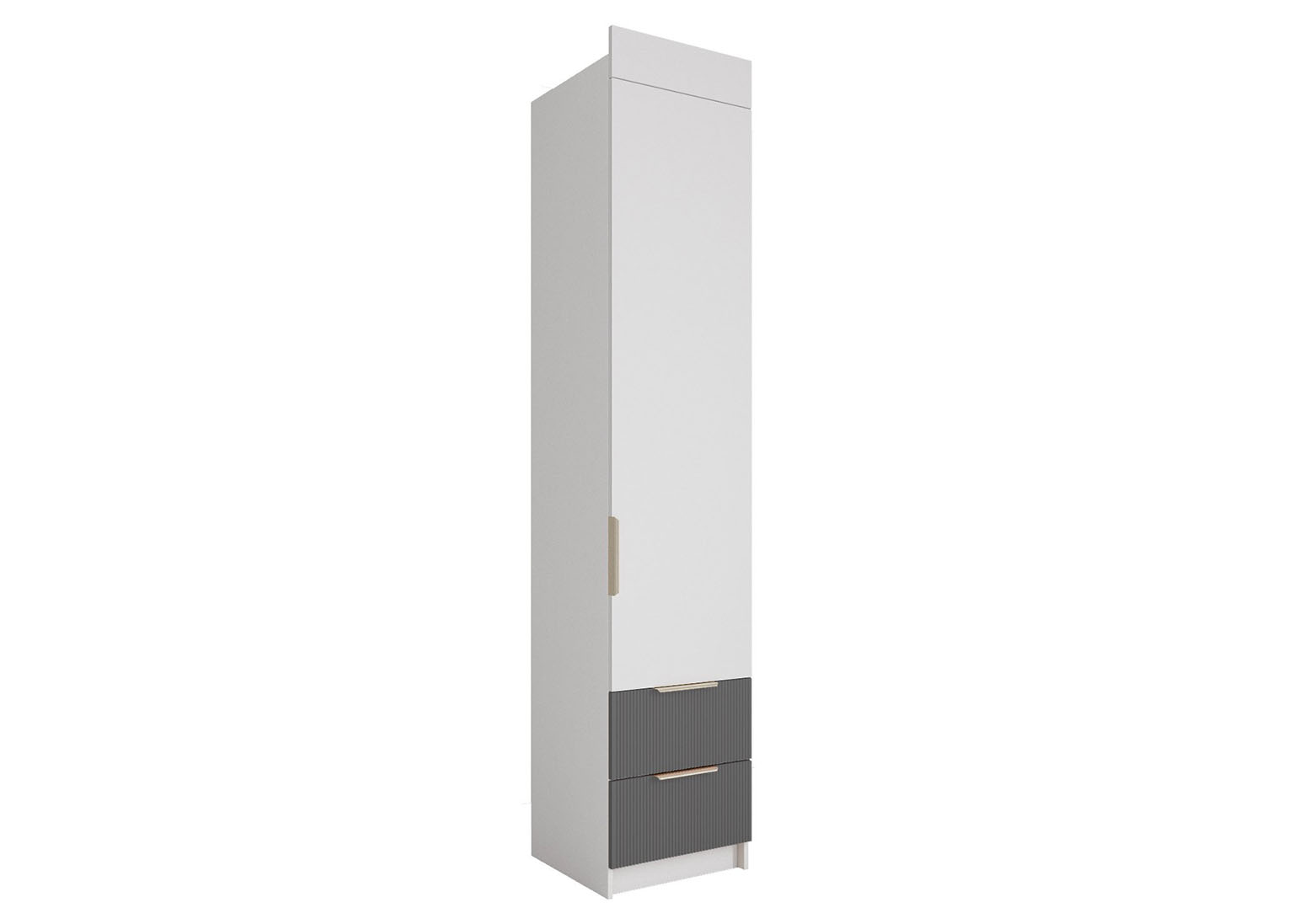 Шкаф-пенал «Лавис» Белый / Графит оснащён фасадами из МДФ с элегантной вертикальной рельефной фрезеровкой, придающей мебели изысканный и уникальный облик.