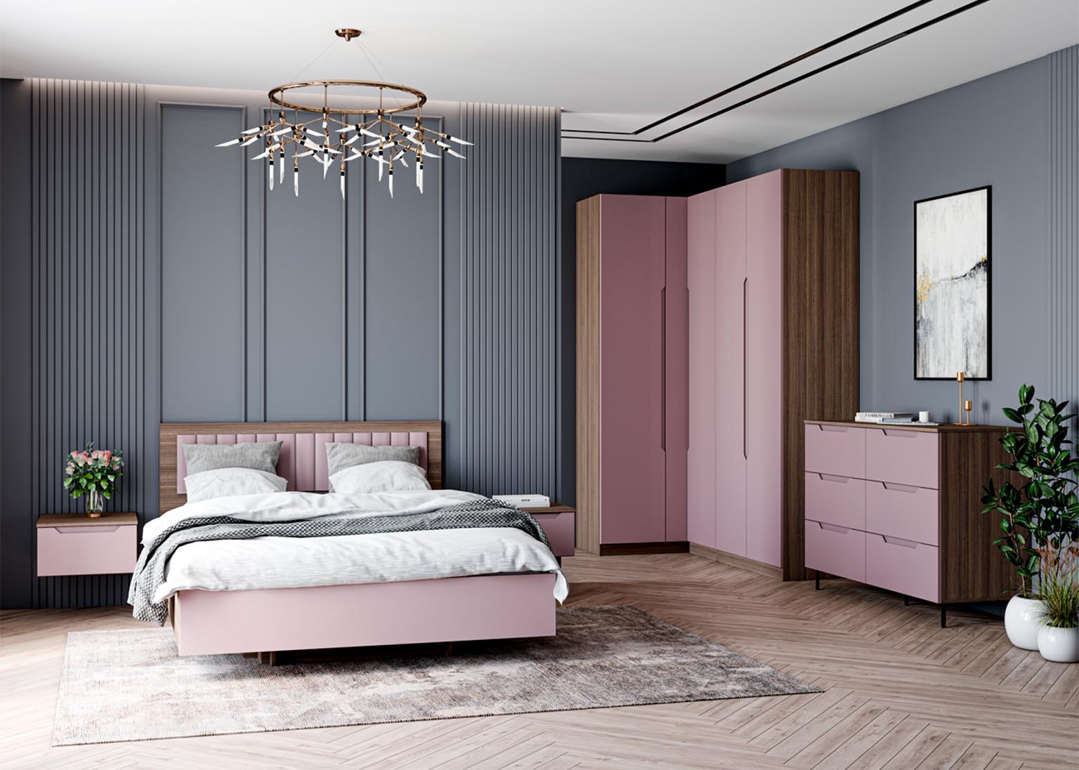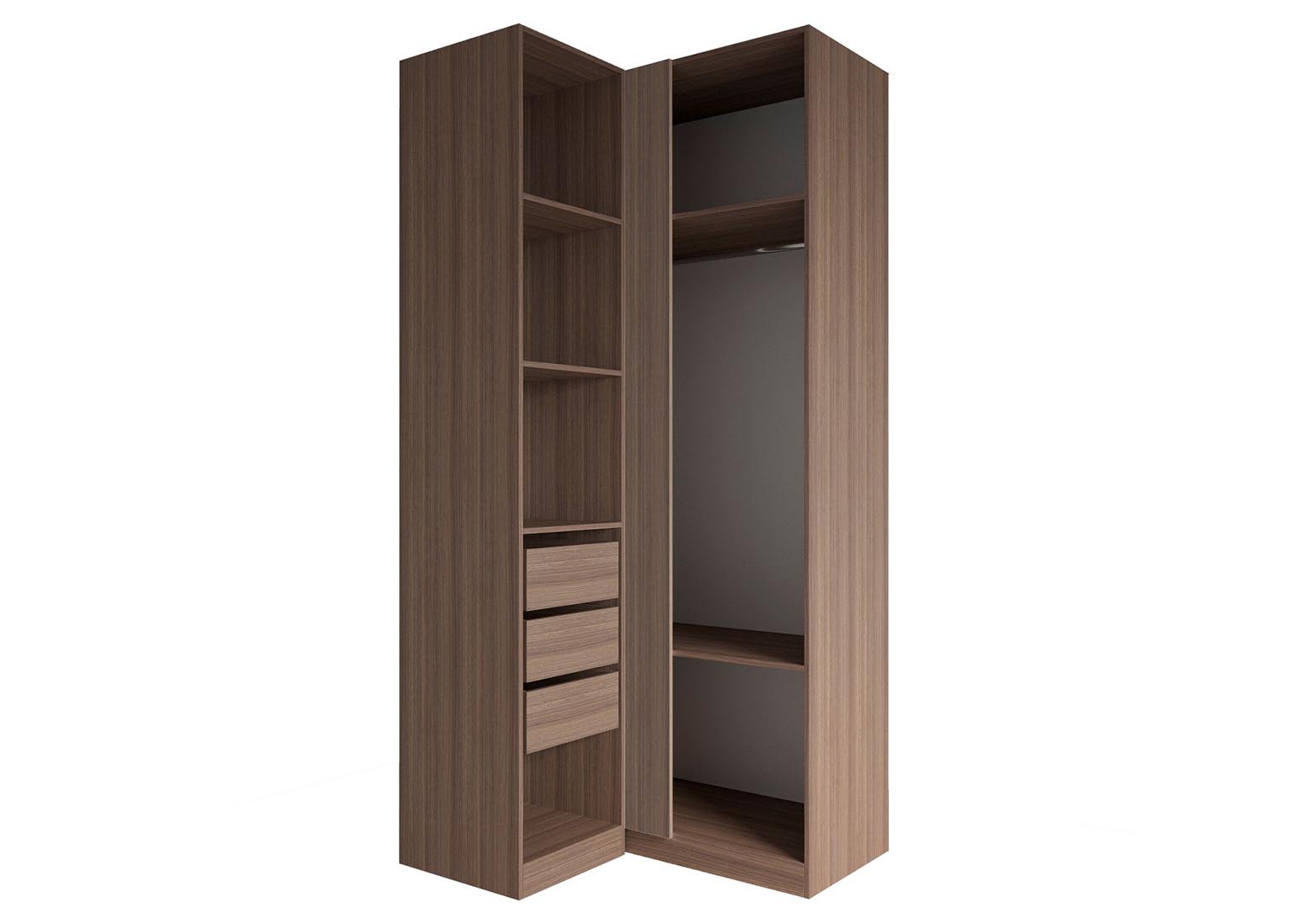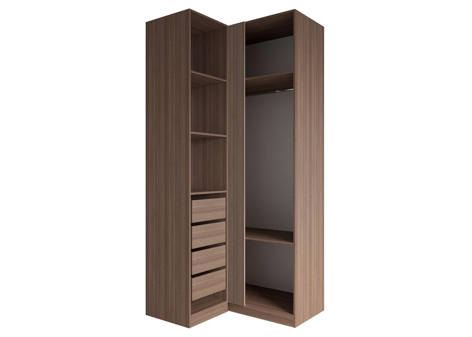 Шкаф угловой «Роза» Пудра — модульный шкаф, который предполагает множество вариантов для организации хранения вещей. Ключевой особенностью шкафа является возможность конфигурации внутреннего наполнения, которая позволяет создавать индивидуальные решения. Базовая комплектация состоит из четырёх узких полок в меньшей секции, двух широких полок в большой секции и одной штанги. Дополнительные полки и ящики приобретаются отдельно. Возможна комплектация шкафа без фасада для сборки открытой гардеробной. Угловой шкаф имеет универсальную сборку, может быть собран как на правую сторону, так и на левую.