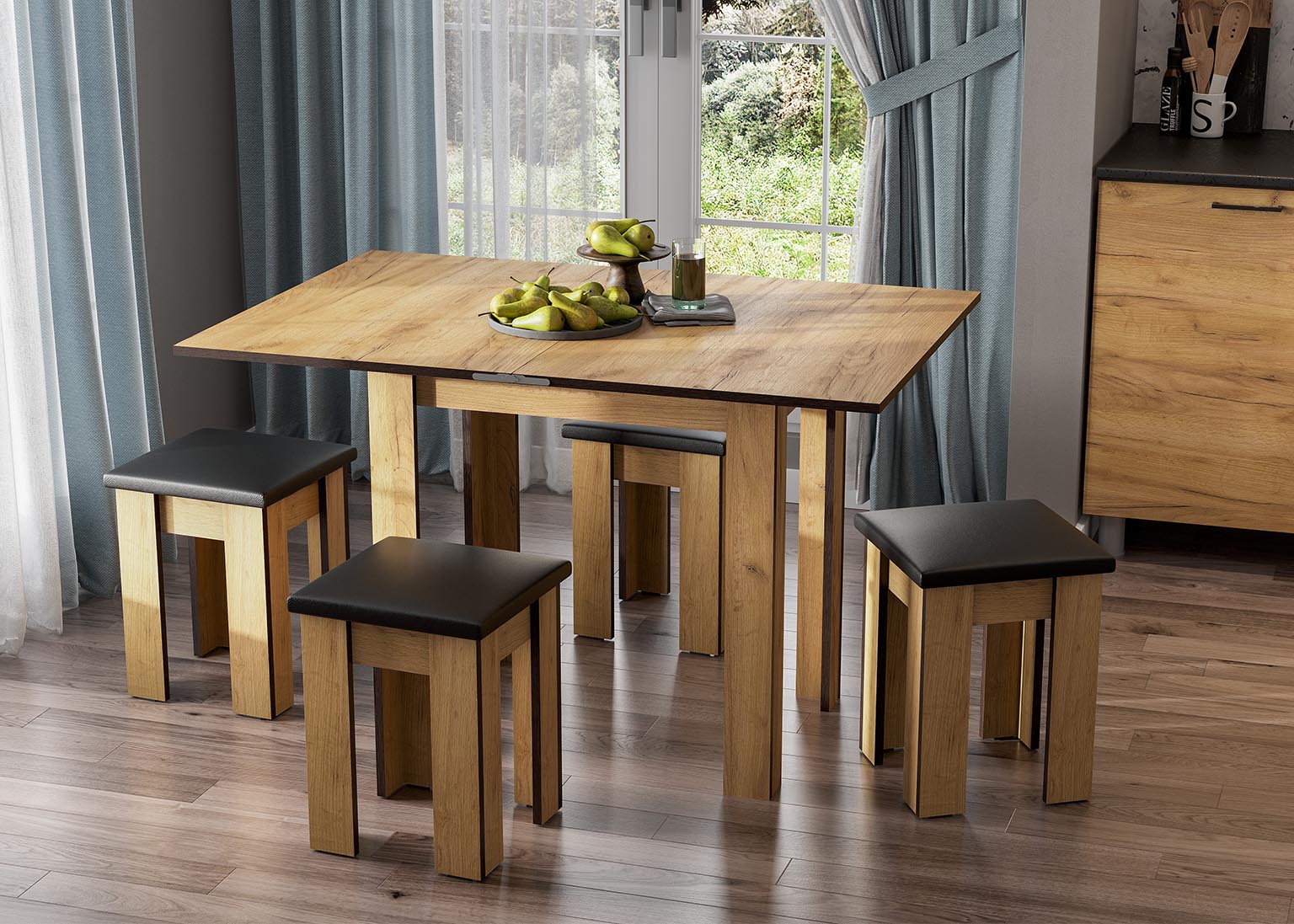 Стол обеденный «СО 3» Дуб Золотой — это раздвижной стол, который имеет компактные размеры в сложенном виде, и имеет столешницу в 2 раза больше в разложенном состоянии. Корпус и столешница стола выполнены из качественного ЛДСП.