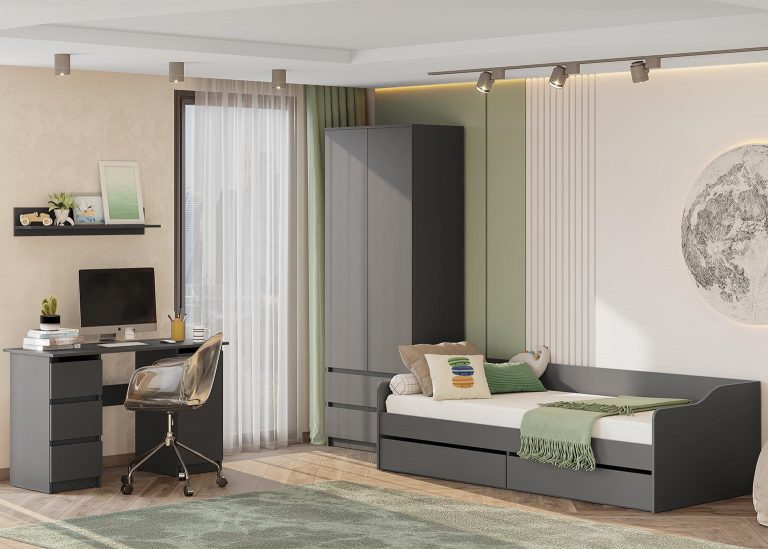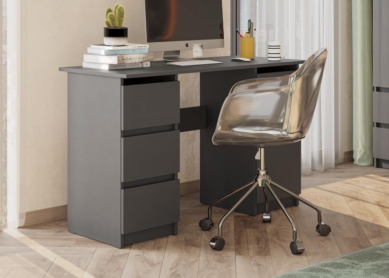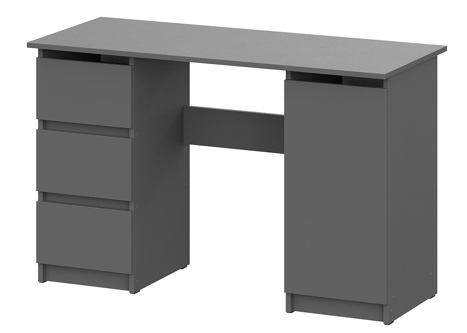 Стол письменный 1200 мм «Денвер» имеет 3 выдвижных ящика, а также тумбу с полкой. Сборка стола универсальная, благодаря чему отсеки с тумбой и ящиками можно собрать как на левую, так и на правую сторону. Сам стол изготовлен из высококачественного ЛДСП в цвете «Графит серый» и выполнен в минималистичном стиле, поэтому не имеет ручек и открывается за выступающие торцы фасадов. Максимальная нагрузка на ящики — 5 кг, на крышку стола — 20 кг
