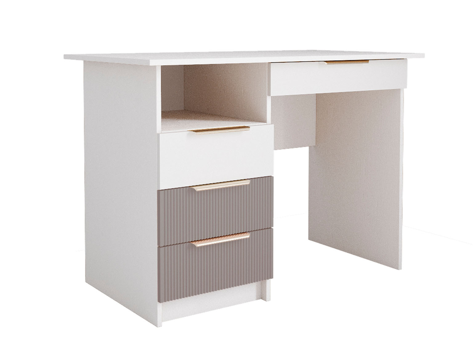 Стол письменный «Лавис» Белый / Грей имеет МДФ фасады с рельефной вертикальной фрезеровкой, которые придают мебели изысканный и оригинальный вид.