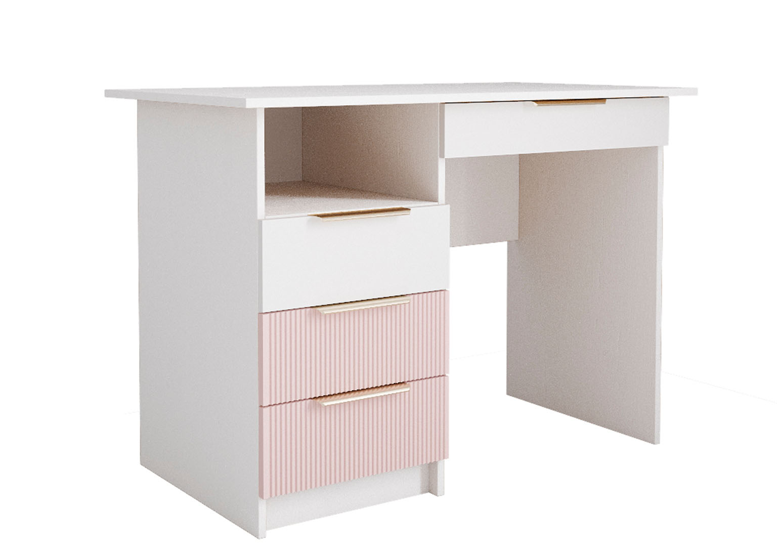 Стол письменный «Лавис» Белый / Роза имеет МДФ фасады с рельефной вертикальной фрезеровкой, которые придают мебели изысканный и оригинальный вид.