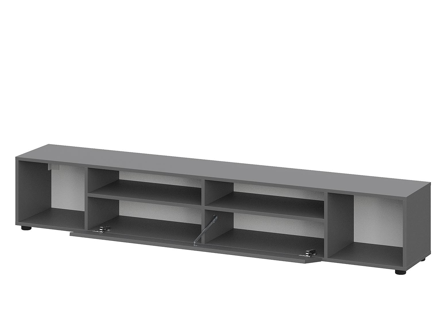 Тумба под ТВ «Денвер» изготовлена из высококачественного ЛДСП в цвете «Графит серый» и выполнена в минималистичном стиле, поэтому створки не имеют ручек и открываются за выступающие торцы фасадов.