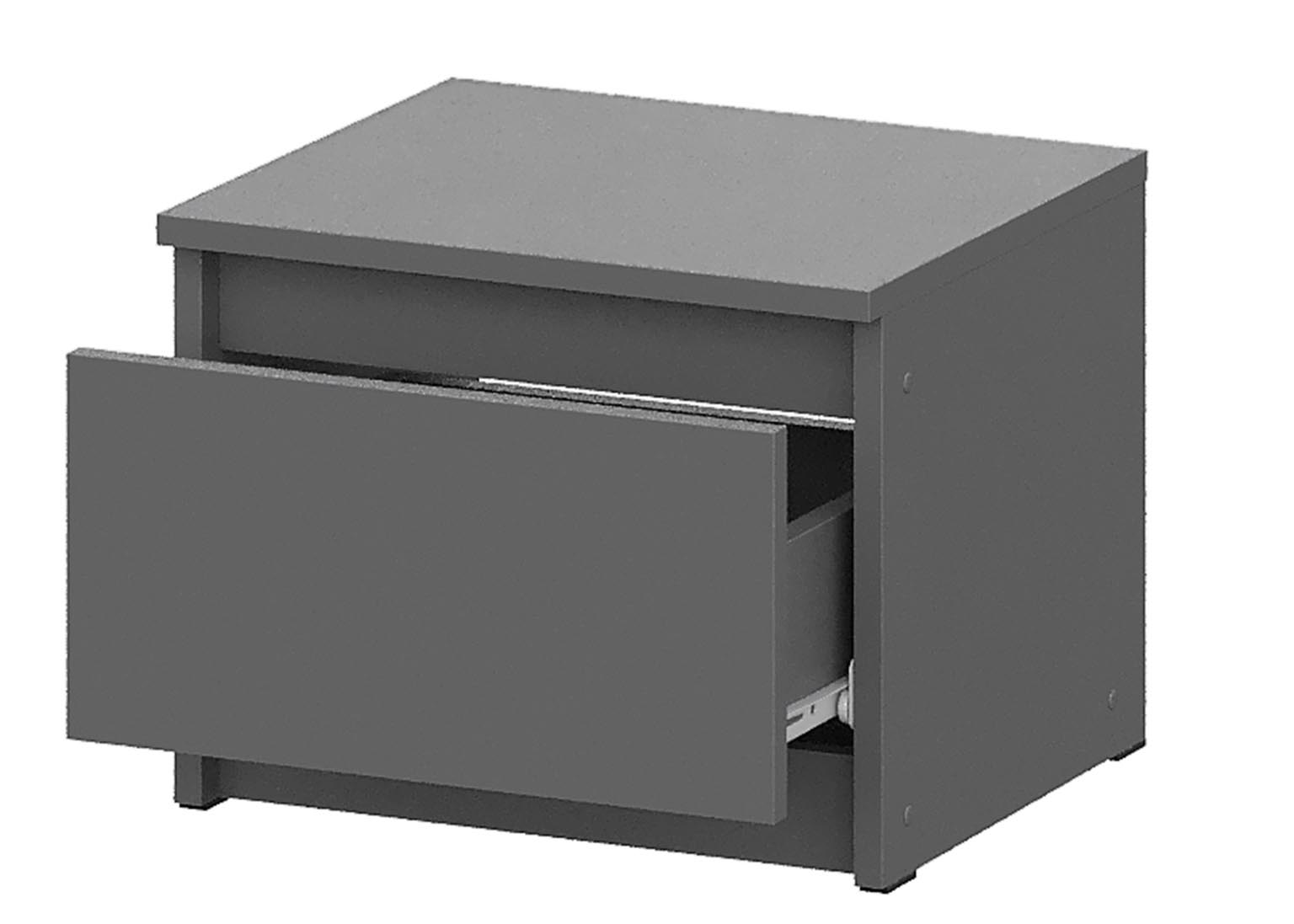 Тумба прикроватная «Денвер» изготовлена из высококачественного ЛДСП в цвете «Графит серый» и выполнена в минималистичном стиле, поэтому ящик не имеет ручек и открывается за выступающий торец фасада. Максимальная нагрузка на ящики — 5 кг.